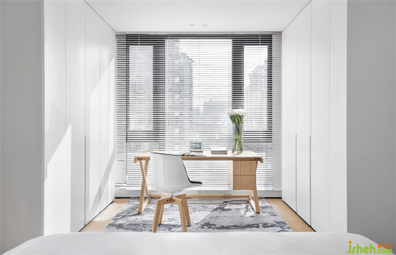 坐在木質(zhì)書桌面前,面前是百葉窗,它那靈活調(diào)節(jié)的葉片具有窗簾所欠缺的功能,不僅能在白天時(shí)有效阻擋紫外線的射入,保護(hù)家具不受紫外線的影響而退色。而且在夜晚,因?yàn)槿~片的凸面向室內(nèi),裝修設(shè)計(jì)影子不會(huì)映射到室外,保護(hù)隱私。