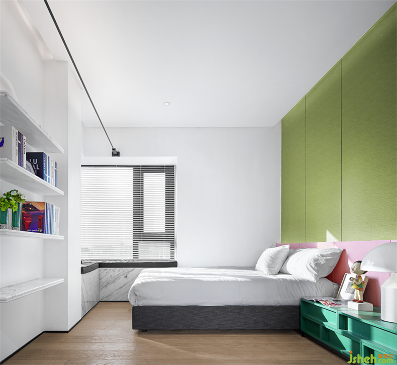女孩房的背景墻采用的是清新的牛油果綠,以及非常具有少女心的淡粉色,裝修設(shè)計(jì)兩者相結(jié)合,清新之中帶有一絲甜美,正是花季少女天真浪漫的顏色。