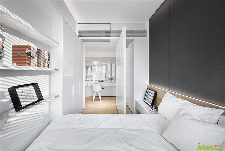 多功能書桌后面是兒童房,設(shè)計(jì)師在這里設(shè)計(jì)了一道趟門,門打開的時(shí)候,可以讓客廳的自然光和風(fēng)自由進(jìn)入。門關(guān)閉的時(shí)候,又可以成為一個(gè)獨(dú)立的辦公區(qū)域。家長(zhǎng)可以坐在上面看書,而小朋友則在房間里玩耍,裝修設(shè)計(jì)大家各有各的空間,既能相互交流互動(dòng),又能做到互不打擾。