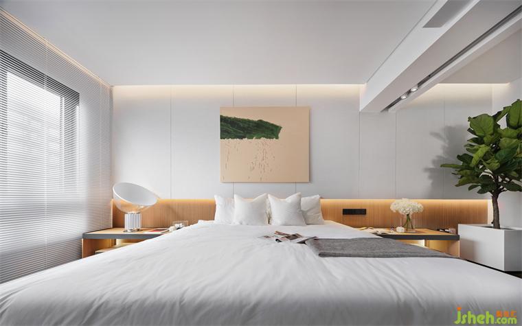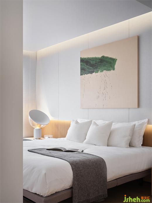 主臥的房門以隱形門的形式從墻體延伸至走廊,將主衛(wèi)和臥室分隔開。主衛(wèi)與過道之間同樣布置了一道雙面鏡面趟門,鏡面將戶外的湖光山色引入走廊,再到主臥,即使是在閑暇休憩之余,也能將室外美景盡收眼底,江景大平層設(shè)計(jì)一覽無余。鏡面趟門前亦布置了李友友設(shè)計(jì)師親筆謄繪的畫作《大?!?,寧靜深邃的海面,清澈透亮的天空,海天一色的畫面中夾雜著幾絲來自家鄉(xiāng)釜山的海風(fēng)。日光熹微,海風(fēng)微咸,勾起人心中淡淡的鄉(xiāng)愁。