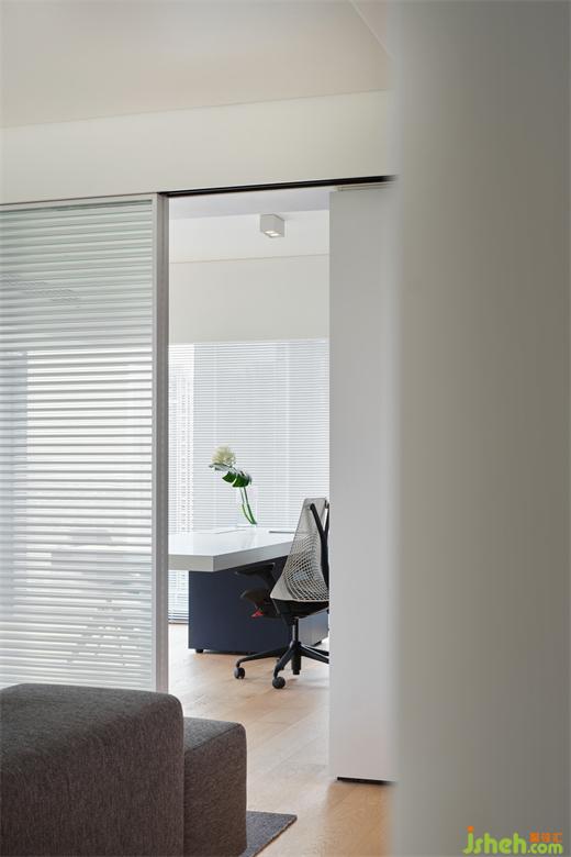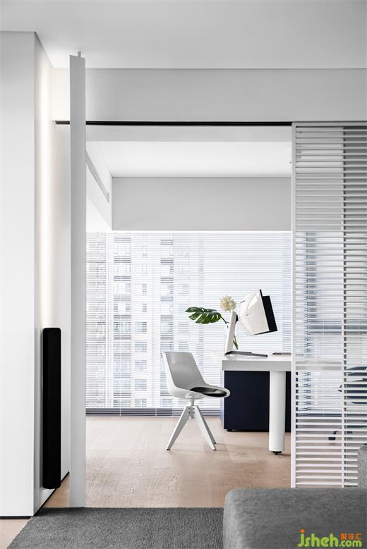 多功能區(qū)以兩扇鏤空格柵木質(zhì)趟門隔開,晨昏日暮,光影穿過木門,在地板和柜子上渲染出光暈,有“疏影橫斜,暗香浮動”的靜謐,也有“和光同塵,與時舒卷”的安然。