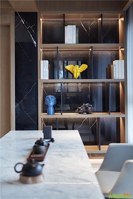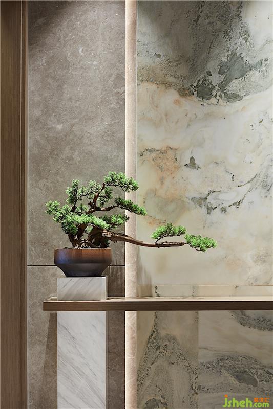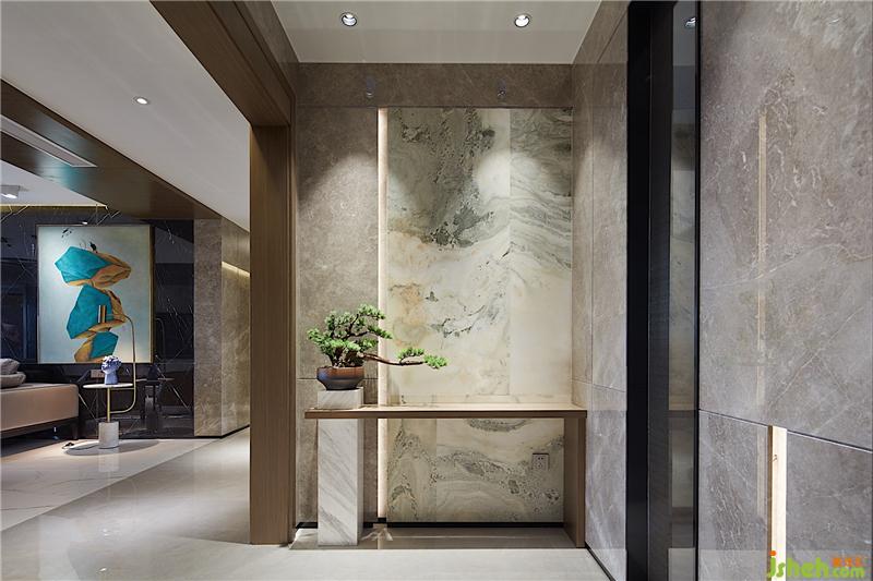 一進入戶門直接就可以感受到空間的流線性。這個動感全部來源于所使用的仿玉石磚橫切面,橫切面上的不規(guī)則線條如小溪流水般潺潺,充滿動感,再加上仿玉石磚是在仿古磚基層上再施一層釉面拋光,就像是化妝時打了個高光,整個面看起來有光澤又顯立體感。提升了入戶門的質(zhì)感。室內(nèi)設(shè)計師