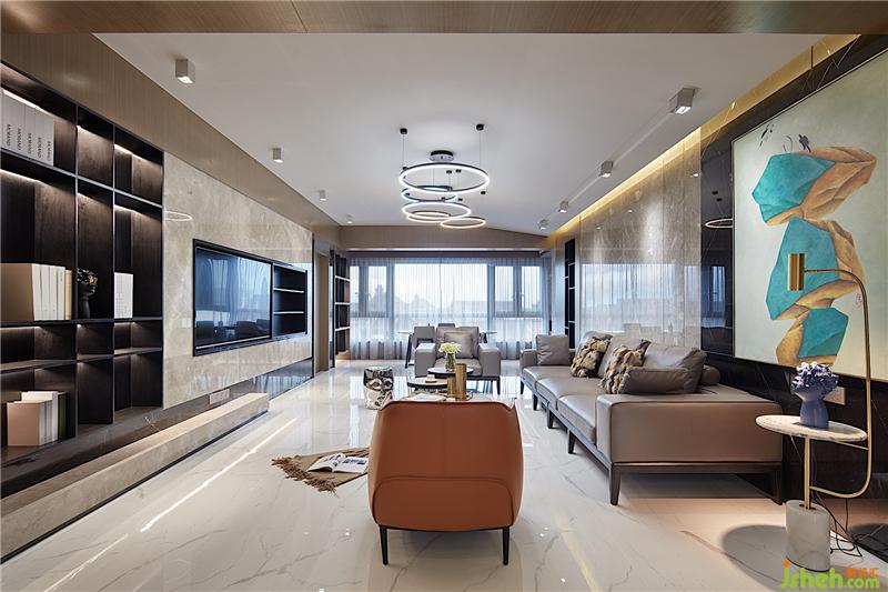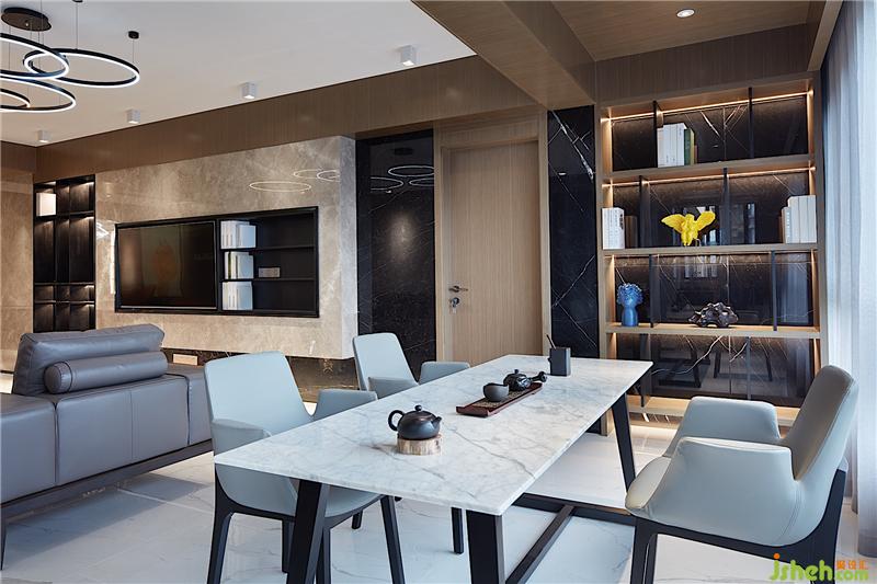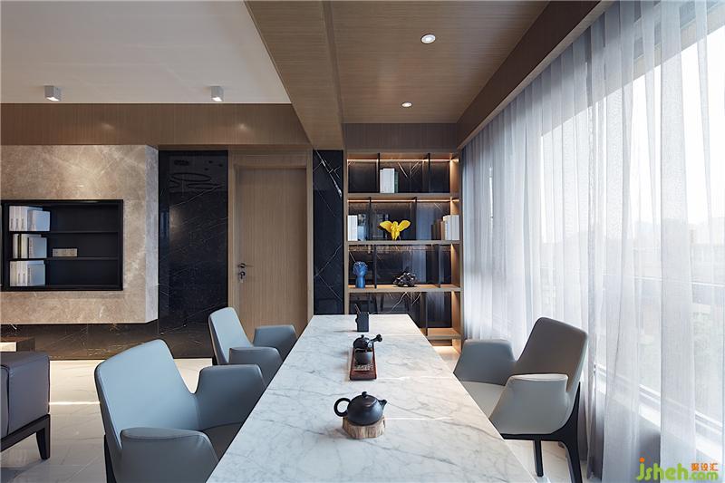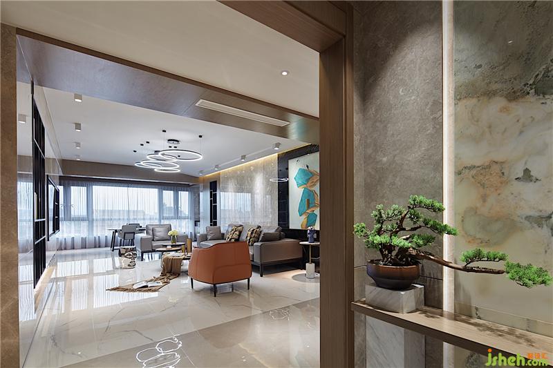 從玄關(guān)進入到客廳,這是一個傾向于實用性的流通空間,玄關(guān)、客廳、茶室三個功能區(qū)之間相互流通。室內(nèi)設(shè)計師