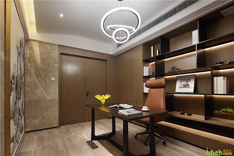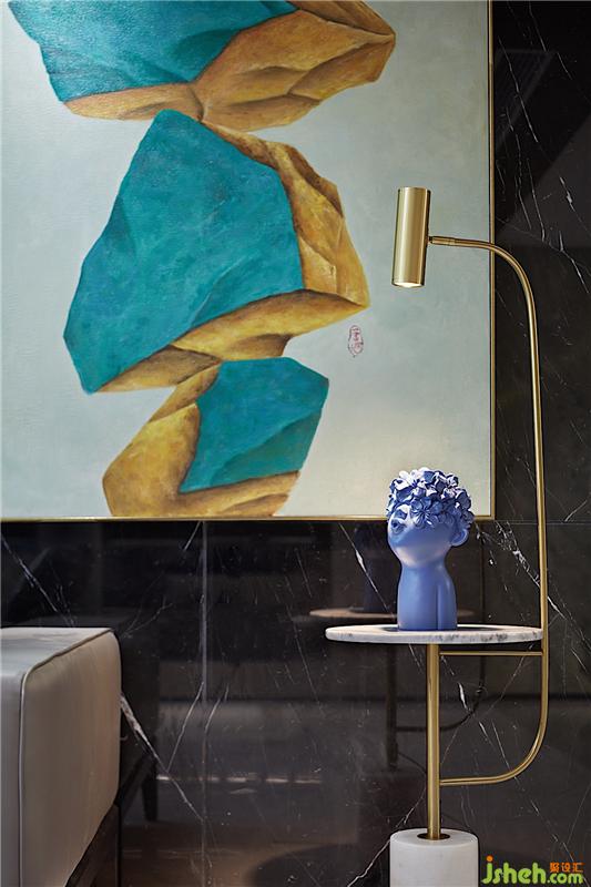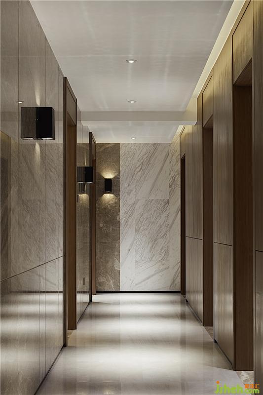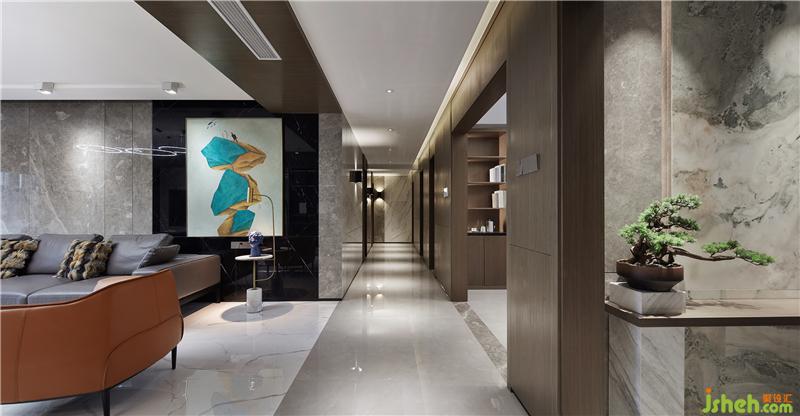 在客廳通往臥室的通道上,設計師做了個吊頂,豐富室內光源層次,達到良好的照明效果。把燈帶放在側面,中間一排射燈所散射的點燈和側面的面光相互輝映,呈現一種幽靜的氛圍。室內設計師