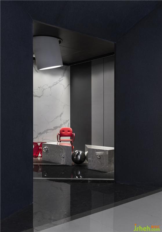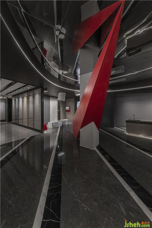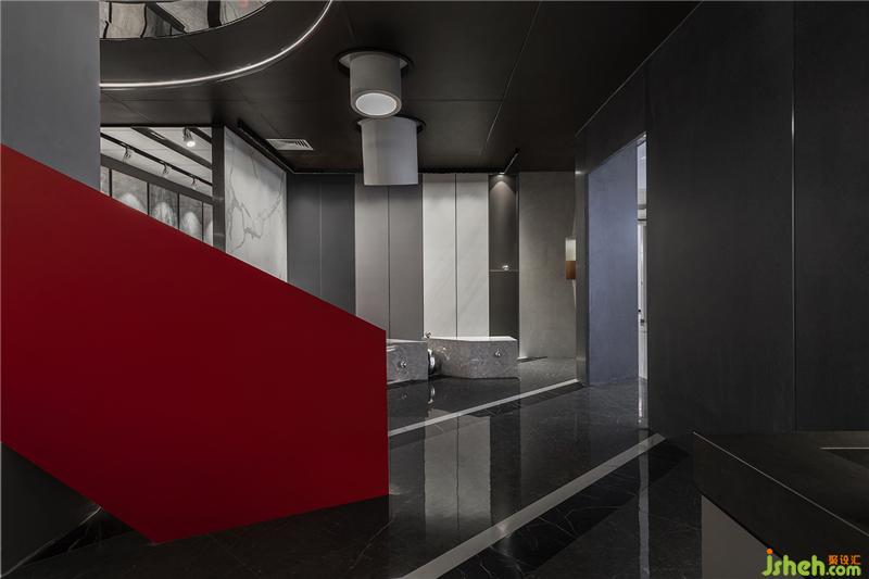 黑、灰的基調(diào)與紅色的熱烈在色彩上以對比傳遞觸覺的模擬體驗;凝練的線條和高度歸納的輪廓刻畫體積,在簡約中迸發(fā)現(xiàn)代主義的力量;置于空間中部的樓梯借線條凝聚的軌跡營造上升感,由實際形態(tài)的牽引在接受者頭腦中“建立”一個結(jié)構(gòu),喚醒記憶以模仿某種感覺。裝修公司