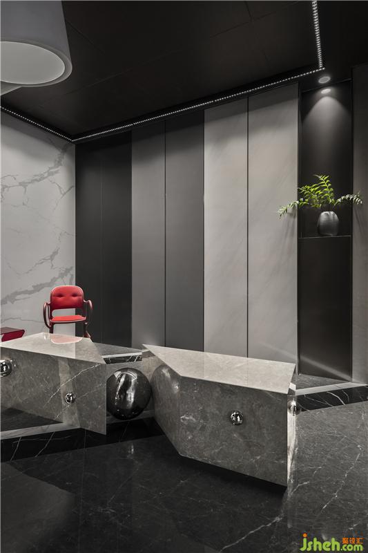 簡單幾何形的嵌套,在收納、吐露后暗示了空間所具有的錯落層次?;パa形之間的球體,穿插著“存在”的難以捕捉。石與金屬、棱角與圓潤、剛與柔,對比之下總能強調(diào)各自對人的感覺啟發(fā)。裝修公司