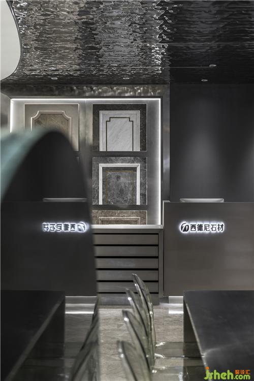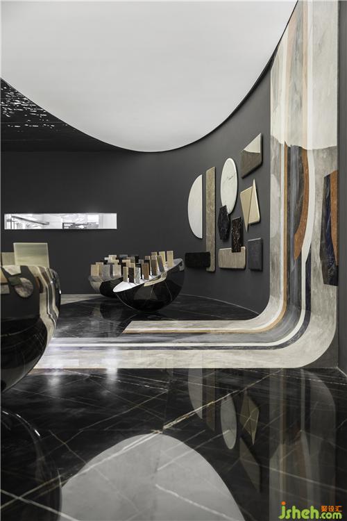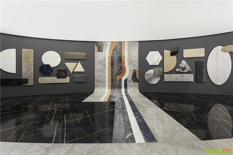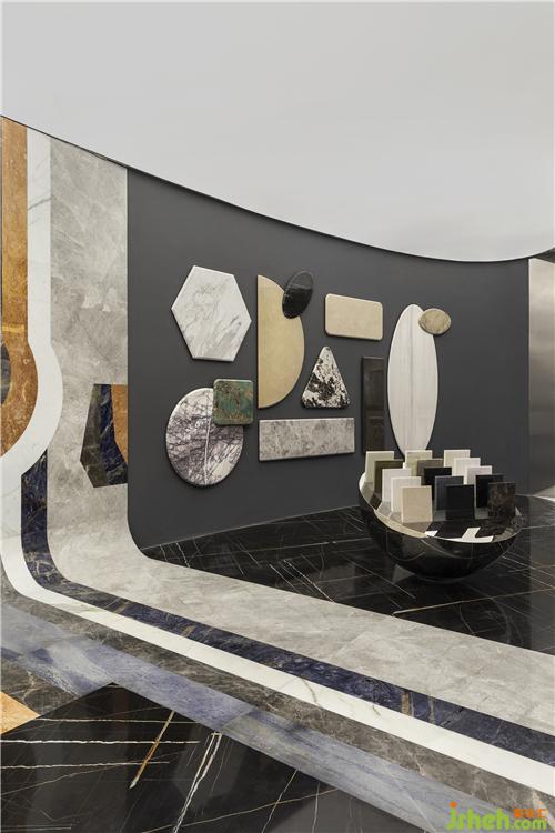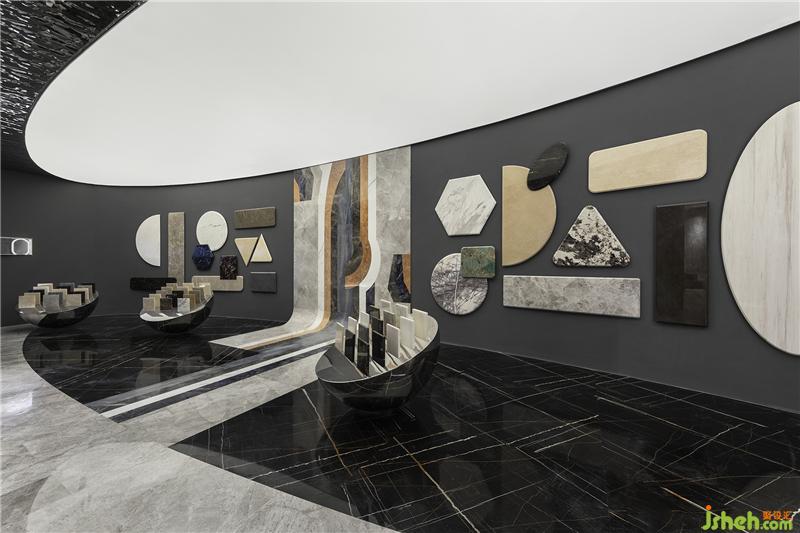 設(shè)計(jì)采用了較多的象征性分割,劃分不同功能分區(qū)的同時保持著空間的開闊性。錯落的高差結(jié)合燈光、家具設(shè)置,使領(lǐng)域變得明確;抽象、概括的幾何形界面因此被自然而然地突顯出來。特意打破傳統(tǒng)石材展示標(biāo)準(zhǔn)的石樣尺寸,采用不同形狀且大小迥異的石材錯落分布,營造視覺上的疏密、聚散變化。 展廳設(shè)計(jì)