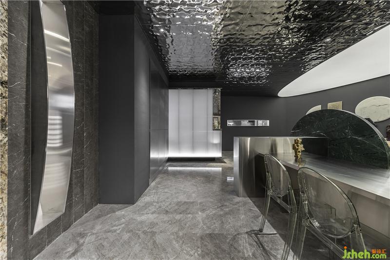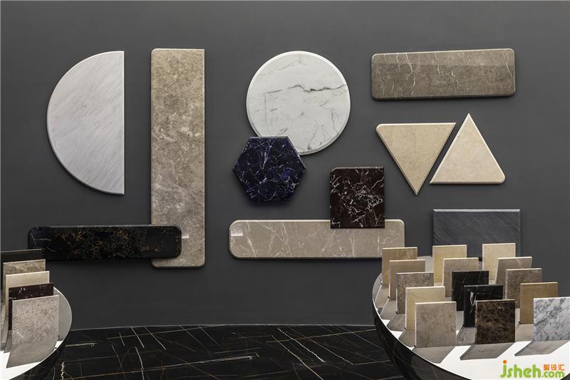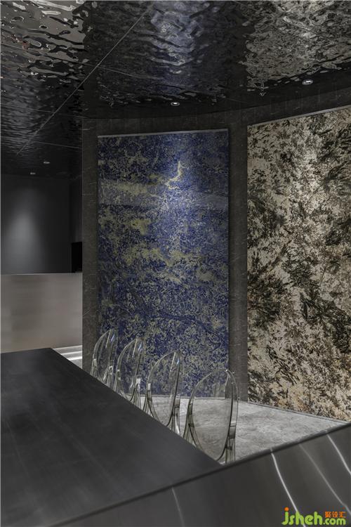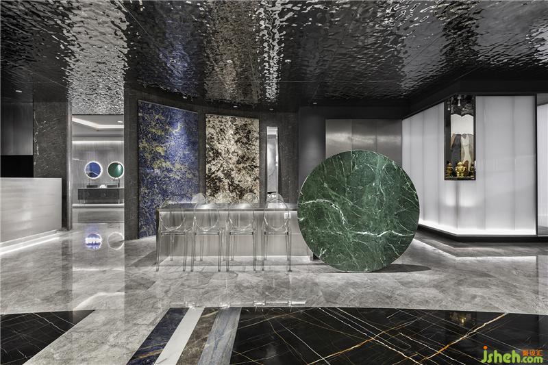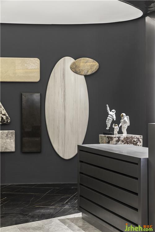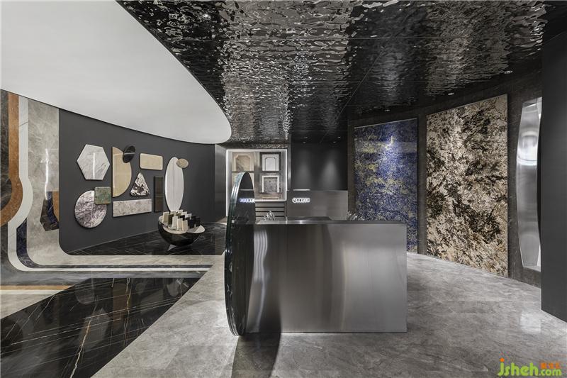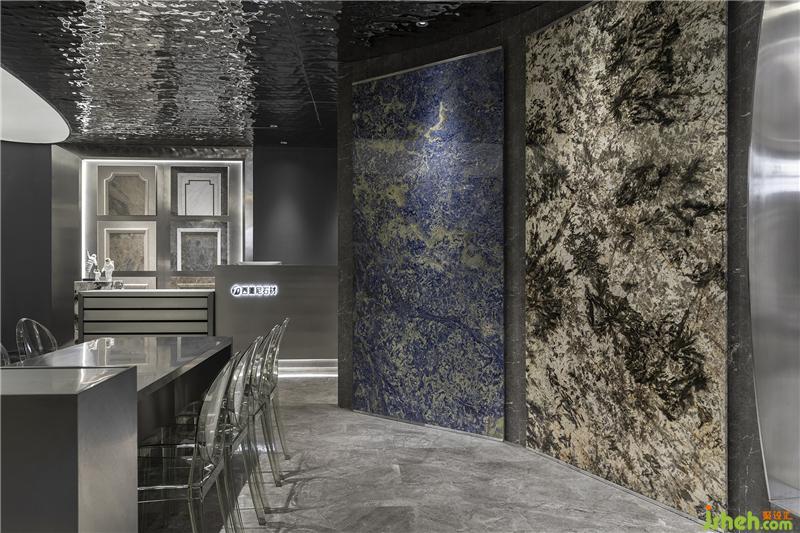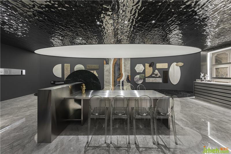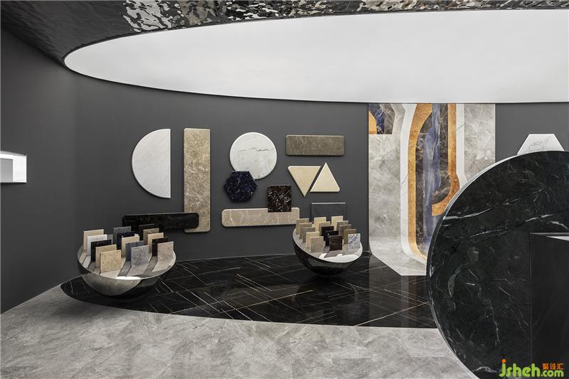展示石材與構(gòu)建室內(nèi)空間的多種材質(zhì)協(xié)調(diào),著重把握色彩、紋理、尺寸及出現(xiàn)的規(guī)律和節(jié)奏。項(xiàng)目室內(nèi)空間的材質(zhì)選擇了大量的無彩色黑、白、灰以平衡并調(diào)節(jié)多色展示石材的炫目效果。大量散射光源設(shè)置,烘托了空曠的氛圍感,散發(fā)些許藝術(shù)氣息。展廳設(shè)計(jì)