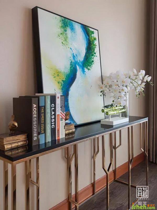 勾勒感的收邊鏡柜,既時(shí)尚又實(shí)用。窗簾、掛畫(huà)及擺件一直延續(xù)空間主題。
