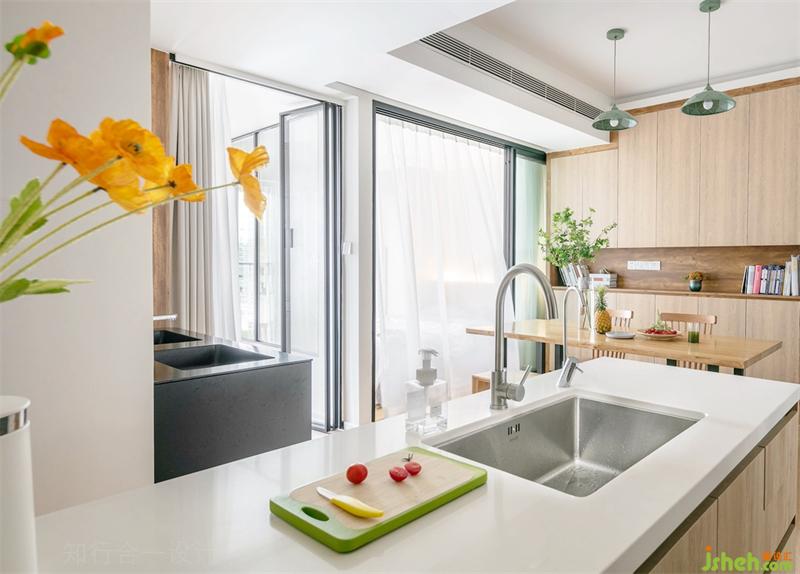 清爽的開放式廚房,整個(gè)廚房的主色調(diào)是黑色+白色+原木色,視覺上很通透。簡(jiǎn)約的櫥柜面板,沒有多余的裝飾線條,里面收納著大包小包的干糧。