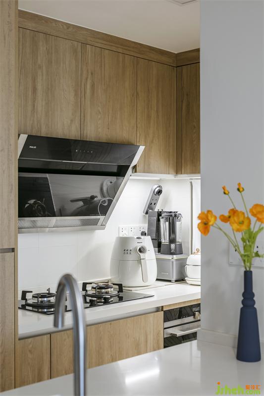 抽煙機(jī)與灶臺(tái)中間貼了與臺(tái)面一致的的白色瓷磚,干凈好打理,灶臺(tái)旁邊留了小家電操作區(qū),家居設(shè)計(jì)特地留了一排的開關(guān)插座,灶臺(tái)下面是碗碟拉籃,洗碗機(jī)洗好的大碗小疊都放置于此。