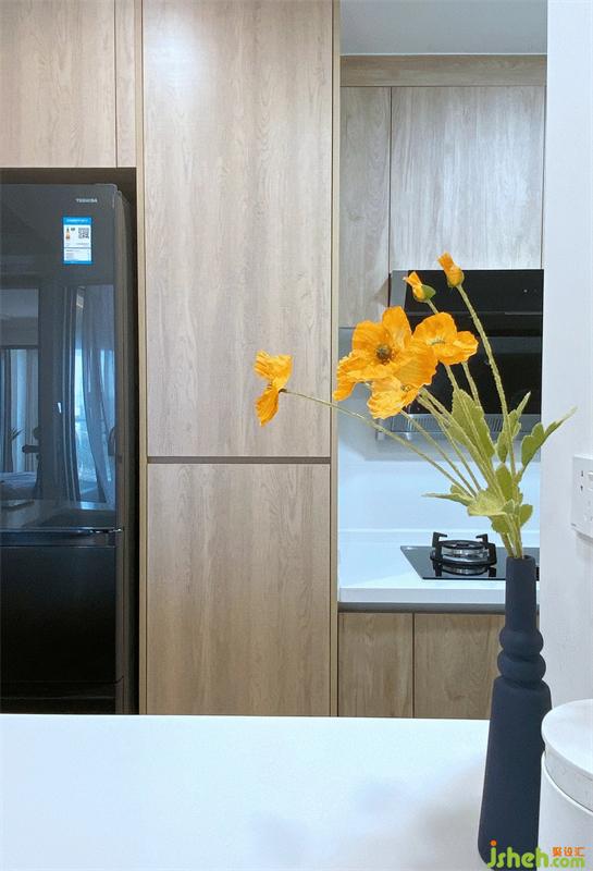 到頂?shù)臋还袂度肓藮|芝酷酷的雙開門冰箱,剛開工就確定了冰箱款式,預(yù)留了冰箱的嵌入位置尺寸,電源等,黑色搭配原木色不但很協(xié)調(diào),還有種酷酷的感覺。