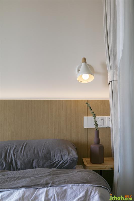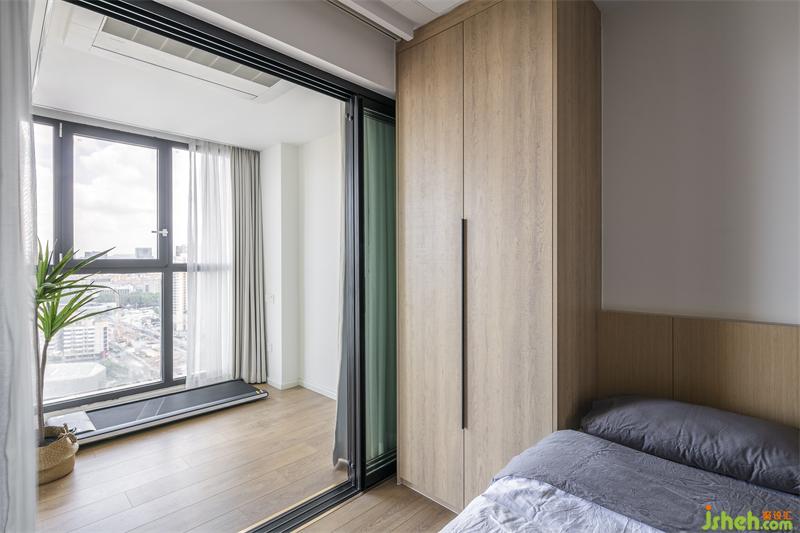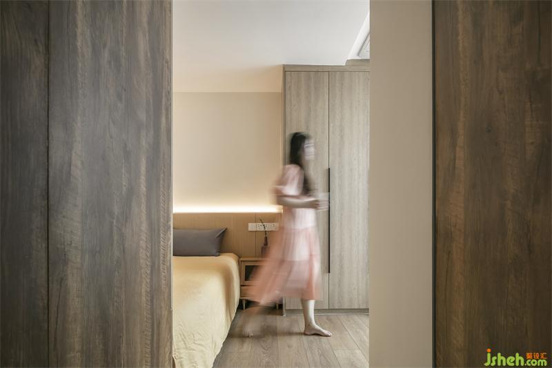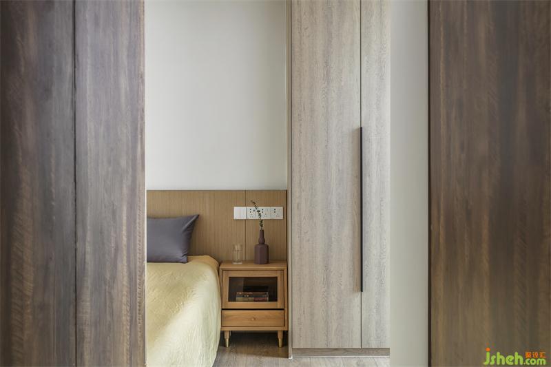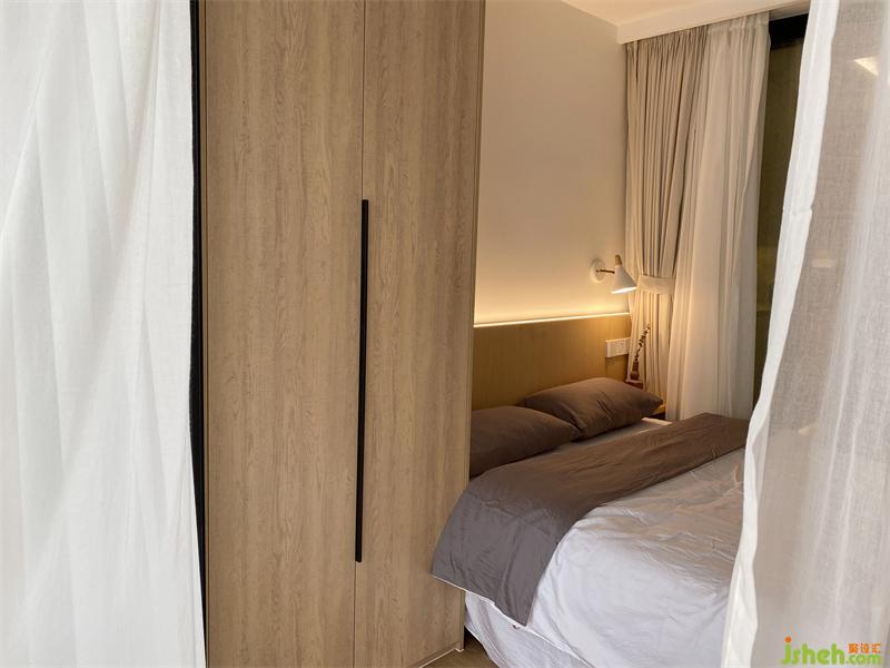 次臥做了一體化的床頭,寬1000mm,由于作息時間不同,S姐姐夫妻是一人一間臥室,次臥平時是她先生住。家居設計門口的過道定制了雙向開門的柜子,里面開始到頂衣柜,過道開是到頂?shù)膬ξ锕瘛?