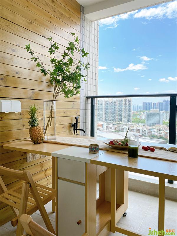 休閑陽臺的光線充足,我們在左邊的墻面做了到頂?shù)姆栏?,增加了陽臺的溫馨感,更有自然氣息,放置了折疊餐桌,不用時疊起來放到一邊不占空間,秋冬之際可以在這個開放的空間涮著喜歡的火鍋丸子,青菜,白蘿卜...