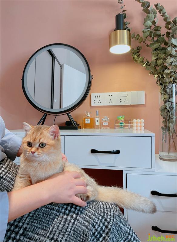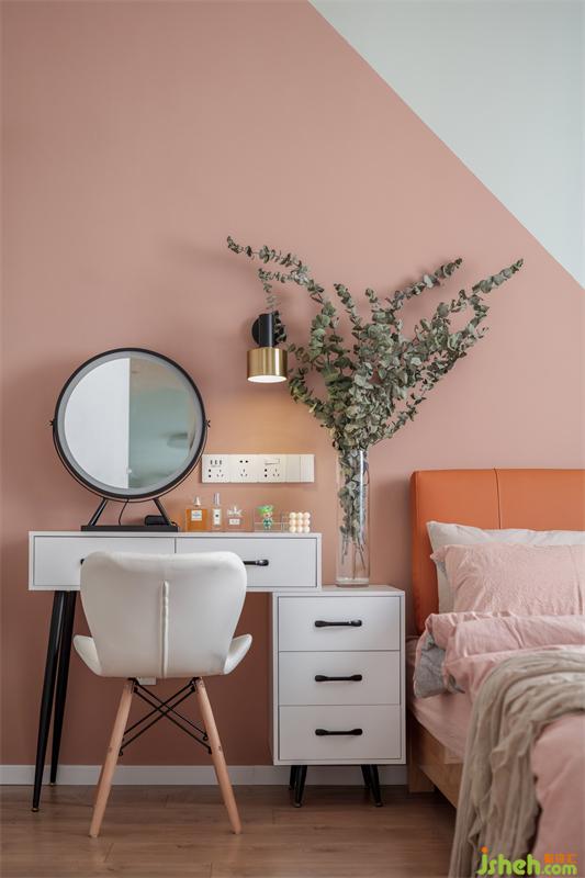 主臥是不規(guī)則撞色的設(shè)計(jì),臟粉色撞淺灰藍(lán);家居設(shè)計(jì)甜甜的粉色多了就會(huì)膩,加上解膩的灰藍(lán)色,像極了咖啡撞奶。