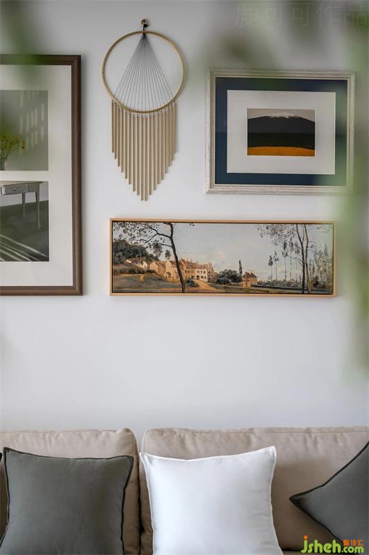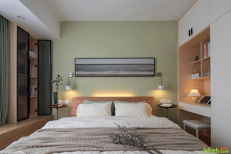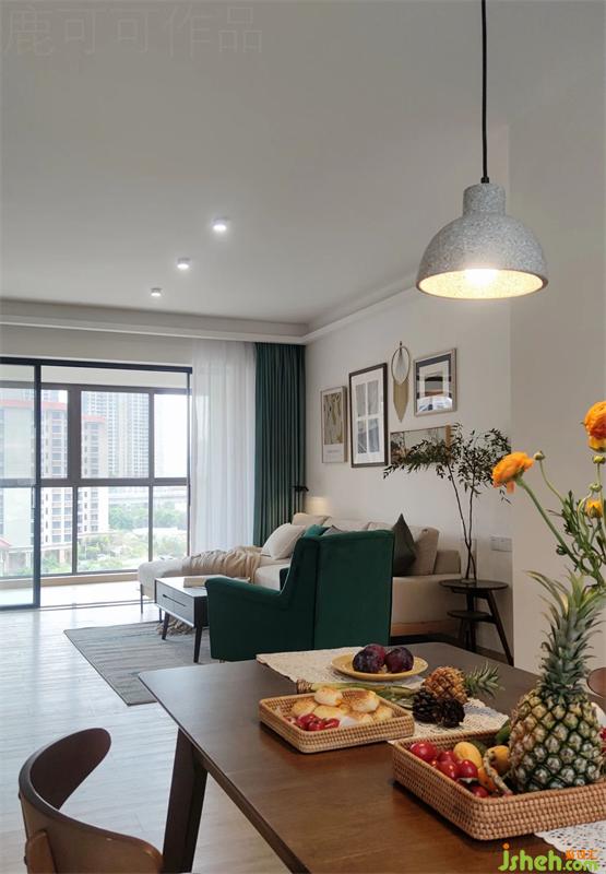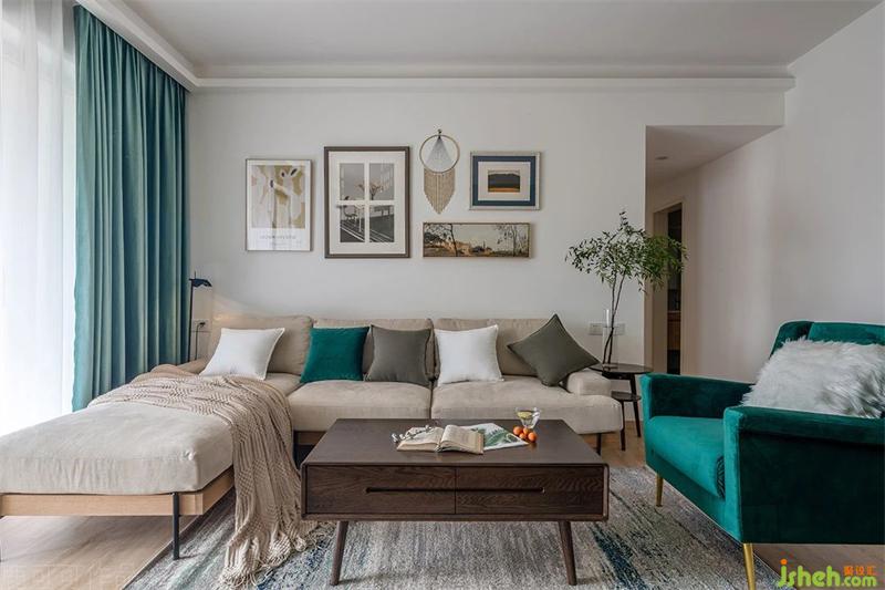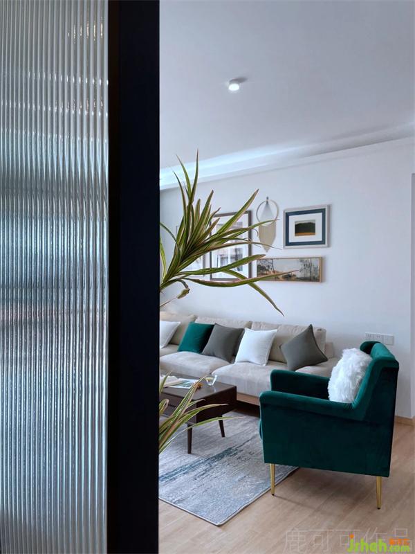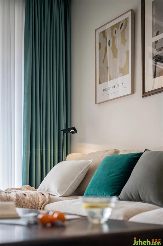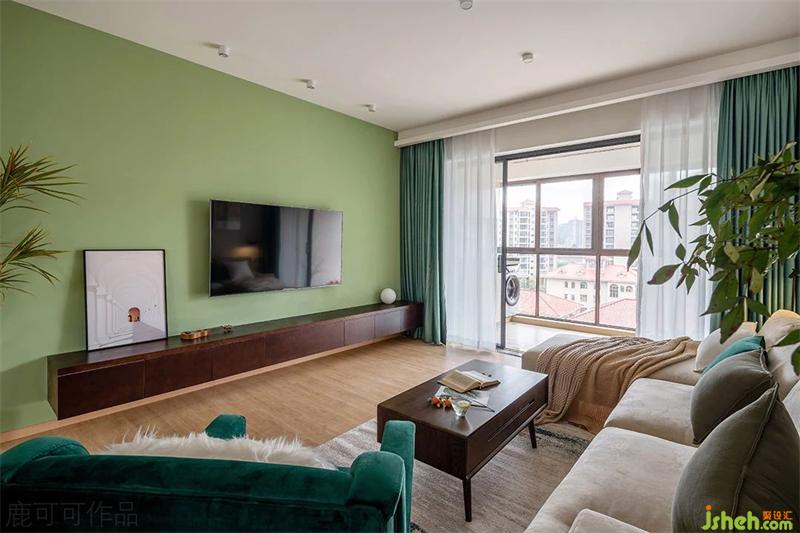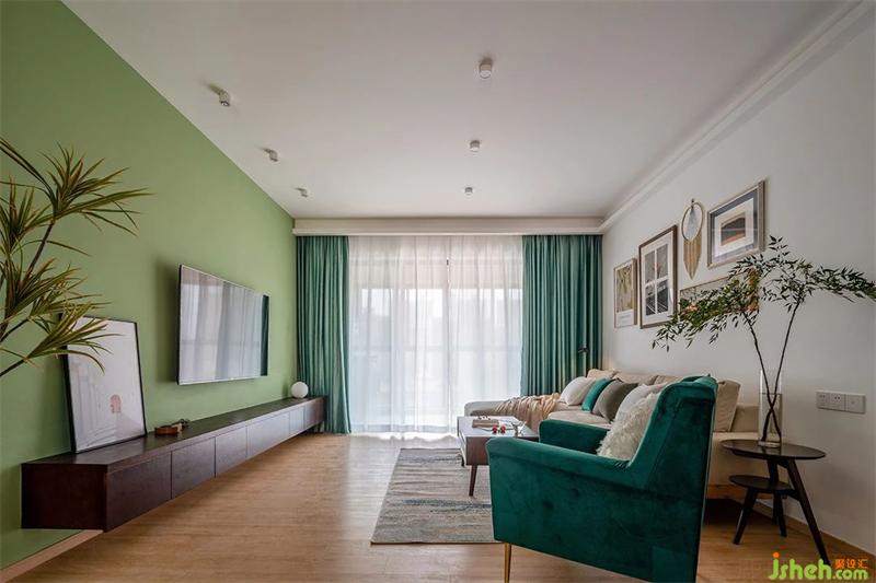柔光絲絨質(zhì)地的綠色窗簾與電視背景做同色系疊加,加深空間層次感。