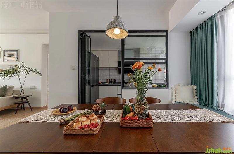 餐廳的餐桌是溫潤(rùn)的胡桃木材質(zhì),可伸縮,根據(jù)就餐人數(shù)自由調(diào)整??ㄗ洗钆涞拇昂熍c客廳的是一致的,前后呼應(yīng)。餐廳看向廚房,家人下廚的身影,日常的對(duì)話,都是生活點(diǎn)滴中的幸福。