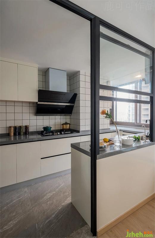 半開(kāi)放式廚房,用折疊門(mén)代替常用的推拉門(mén),使空間更開(kāi)闊,設(shè)計(jì)了使用率最高的G型廚房,與餐廳相連處沒(méi)有做隔墻,以島臺(tái)的形式做了地柜,上面是操作臺(tái)面,搭配了不占空間的上下推拉窗,日常洗菜切菜都可與餐廳的家人交流互動(dòng),不會(huì)有在廚房埋頭做事的孤獨(dú)感。