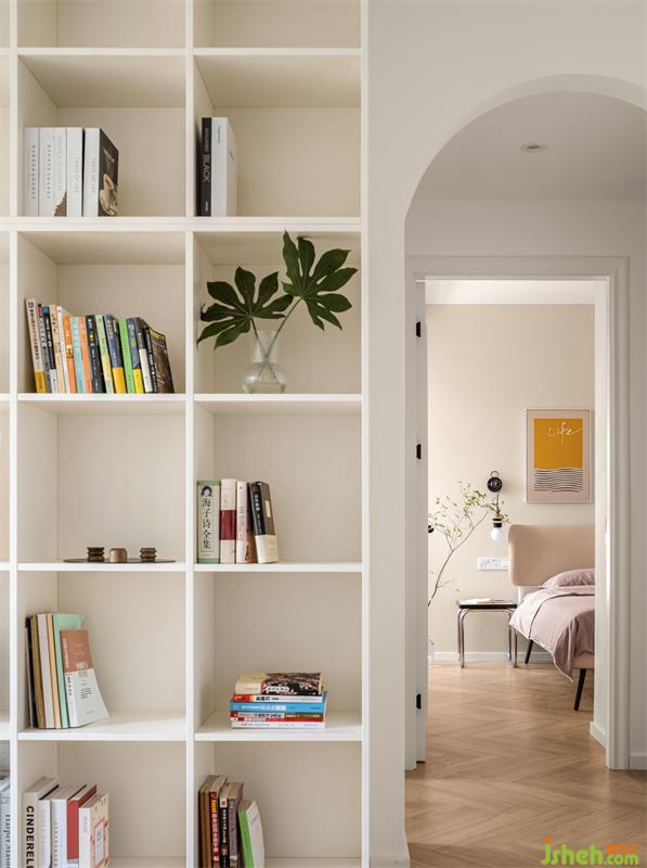 定制的奶油白到頂書柜做了統(tǒng)一的方形結構,統(tǒng)一的底色擺上各式書籍與個性收藏品的包容性很強,擺放品大小不一,卻錯落有致。