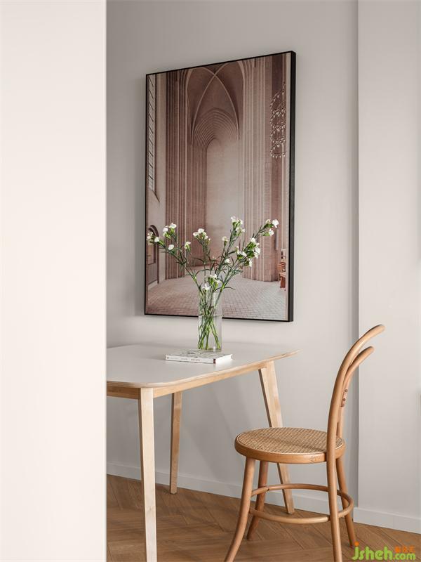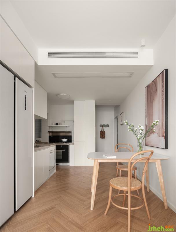 餐廳與廚房這邊的窗戶采光較弱,大面積留白的墻面通過光線反射使空間不開燈也比較明亮通透。