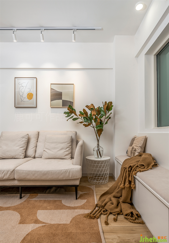客廳沙發(fā)旁邊有一個(gè)承重柱,深度是420毫米,齊平柱子的厚度做了一個(gè)收納卡座,下面做了可以儲(chǔ)藏客廳收納物品的無把手抽屜,由于空間的限制客廳沒有擺放單人位,長度達(dá)2米的卡座可兼顧朋友聚會(huì)時(shí)坐。