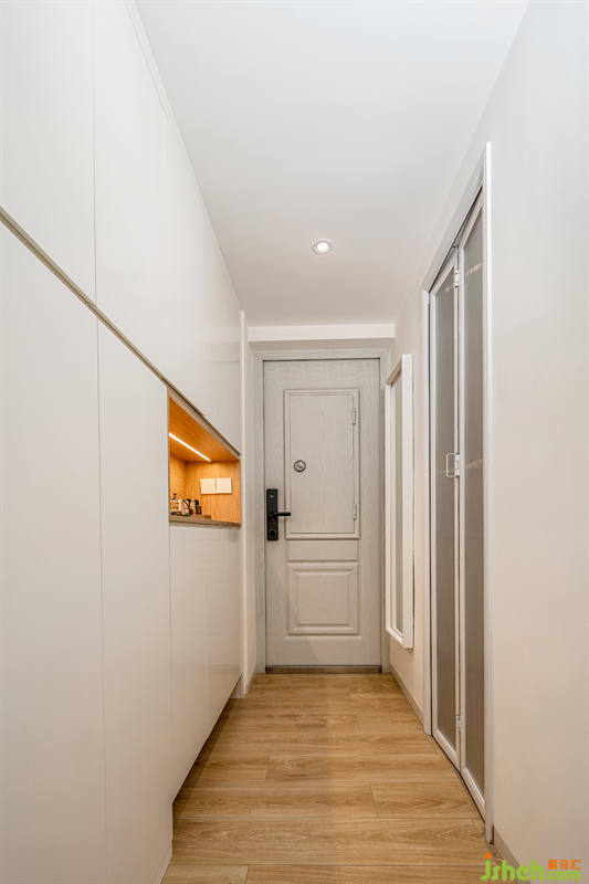 進(jìn)門左手邊全身鏡,右邊到頂鞋柜,鞋柜離地15cm放居家拖鞋,1米位置做凹位,放置回家的隨手物品。入住后,葉子在中空位放了無線充電板,手機手表,耳機,回來電源就安排上,完美