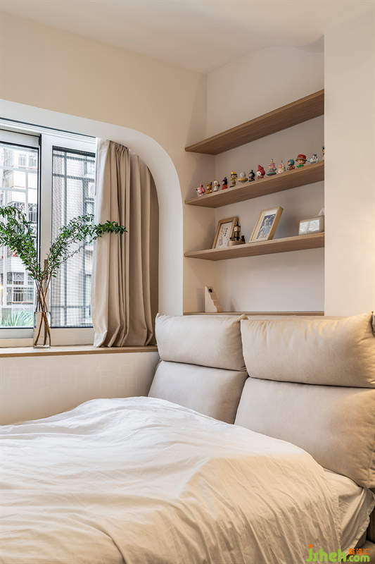 主臥整體奶呼呼的日式原木風(fēng),床的正上方有一條大梁,設(shè)計上做了弧形小波浪造型處理,很好的修飾了大梁,層高也不受影響。