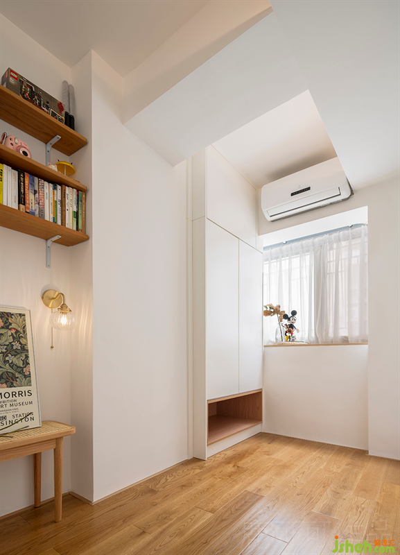 窗戶重新?lián)Q了鋁合金窗,窗臺上鋪貼PVC石塑防水地板,地板的紋理質(zhì)感和真正的木頭相似度很高,和床頭的木層板呼應(yīng)。