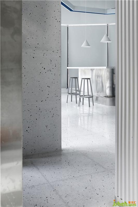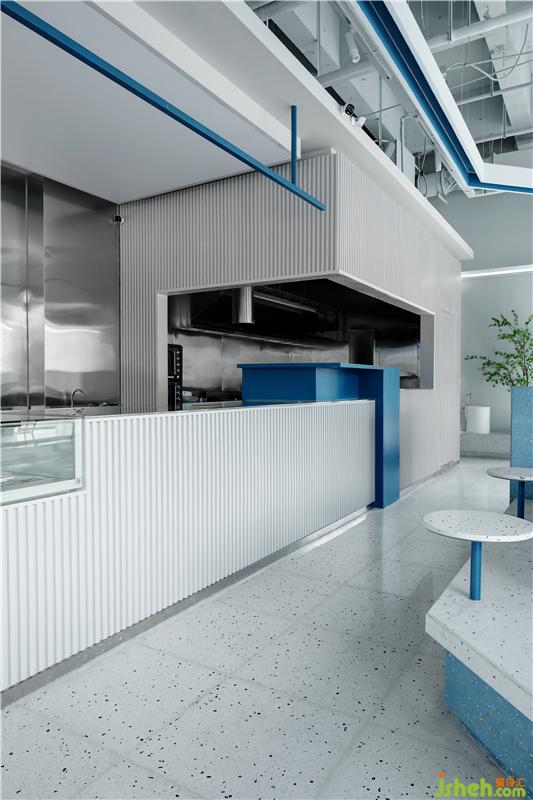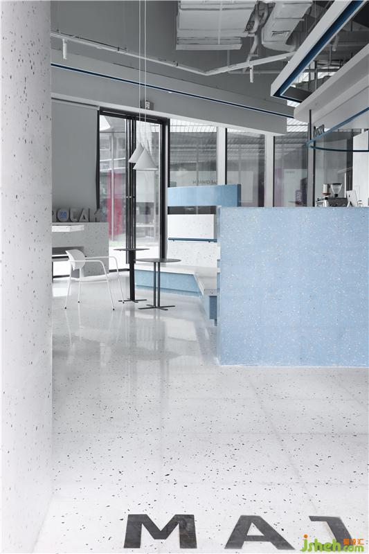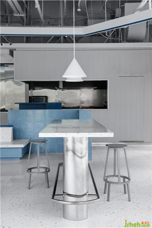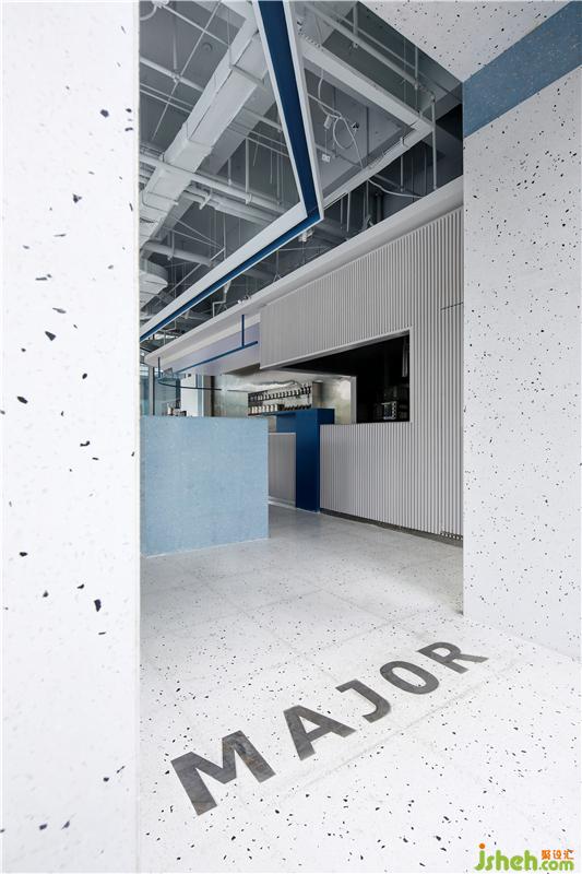 餐廳設(shè)計在整體室內(nèi)空間上,設(shè)計團隊突破傳統(tǒng)商務(wù)風(fēng)格的沉重色調(diào),提取了MAJOR的品牌標(biāo)志色——藍色、白色,與金屬進行碰撞,時尚而又清新。不銹鋼與顆粒感的水磨石,為整個空間帶來獨特的肌理感的同時并賦予精致的細(xì)節(jié)和空間特征。