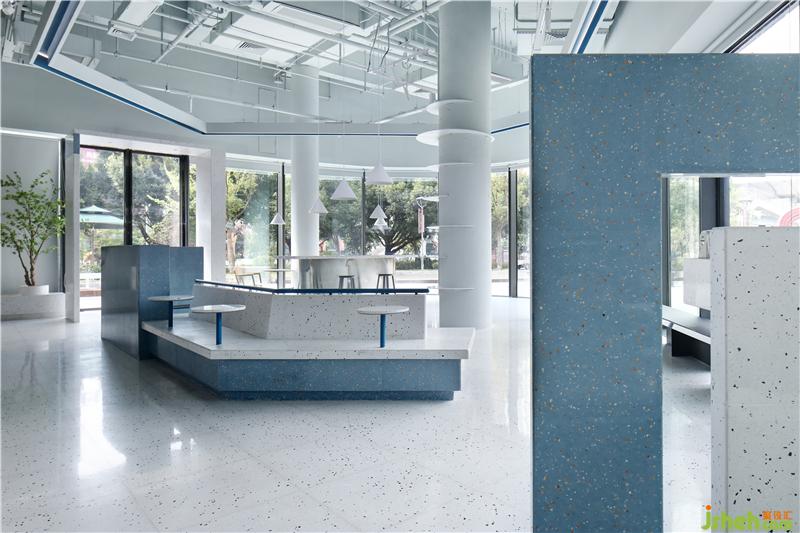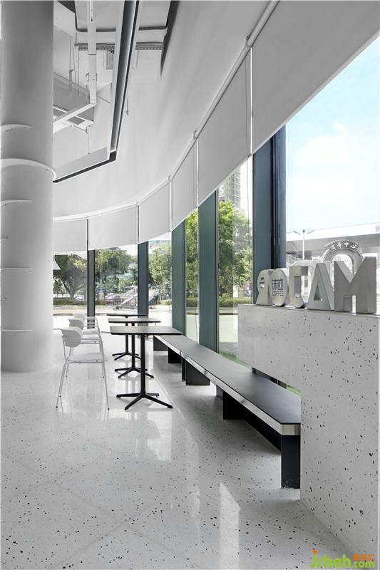 吧臺(tái)和制作輕食的半開(kāi)放廚房被安排在室內(nèi)唯一的墻面區(qū)域,室內(nèi)桌椅的擺放根據(jù)異形的室內(nèi)空間及其動(dòng)線,散而有序的分布。餐廳設(shè)計(jì)