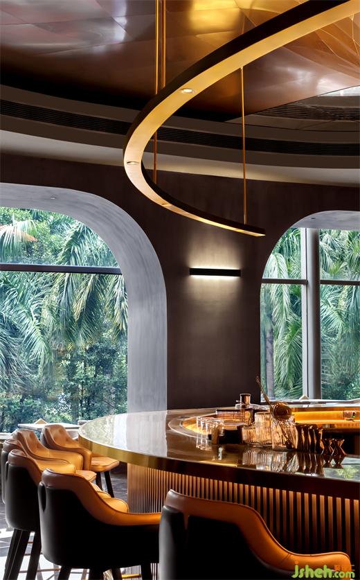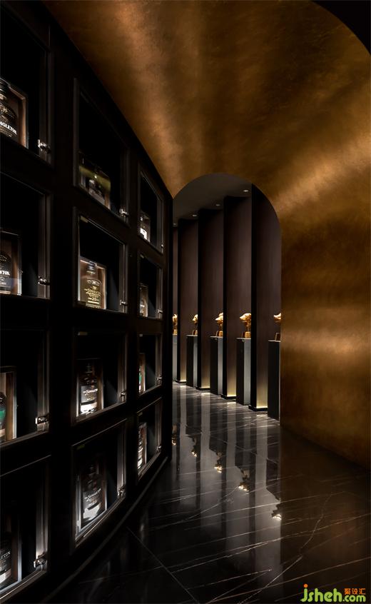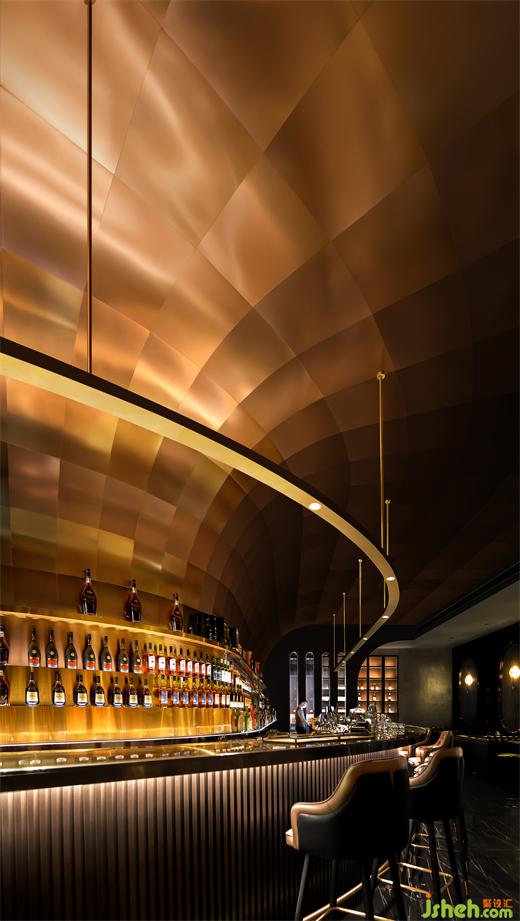 空間中心處,以威士忌酒中固有色的“金色原漿”為藝術(shù)原型,深圳酒吧設(shè)計(jì)以水為題,意為一尺水,百丈波,滔滔不息,使韻律及活力得以在空間中傳遞,同時(shí)也象征著新生。喻比莊子筆下《逍遙游》水擊三千里,摶扶搖而上者九萬(wàn)里。