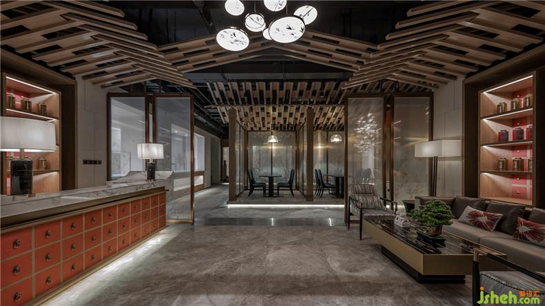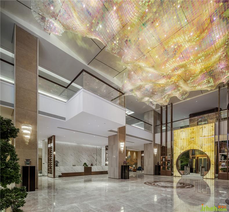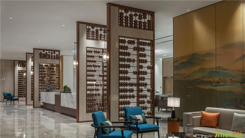 進(jìn)入大堂映入眼簾是凌空壯似涌動著的水晶吊燈映襯于空間中,似星光點(diǎn)點(diǎn),璀璨斑駁。裝修設(shè)計(jì)算盤式的隔斷屏風(fēng)分隔了大堂與休息區(qū),木質(zhì)算珠成串鋪排,極具古樸典雅。千里江山圖在沙發(fā)區(qū)背景靜靜流淌著光彩,組成一個(gè)大空間的基調(diào):一虛一空靈,一實(shí)一莊重。配合著大廳播放的“千里江山圖”及新東方企業(yè)兼顧人文文化及企業(yè)文化的介紹宣傳,調(diào)動著視覺感官和聽覺感官。