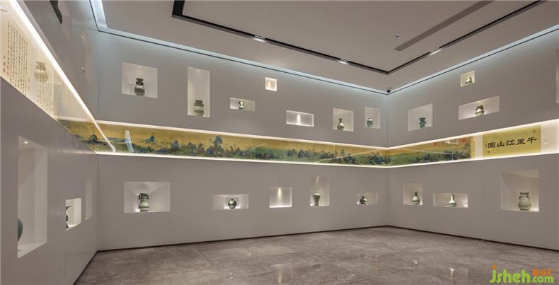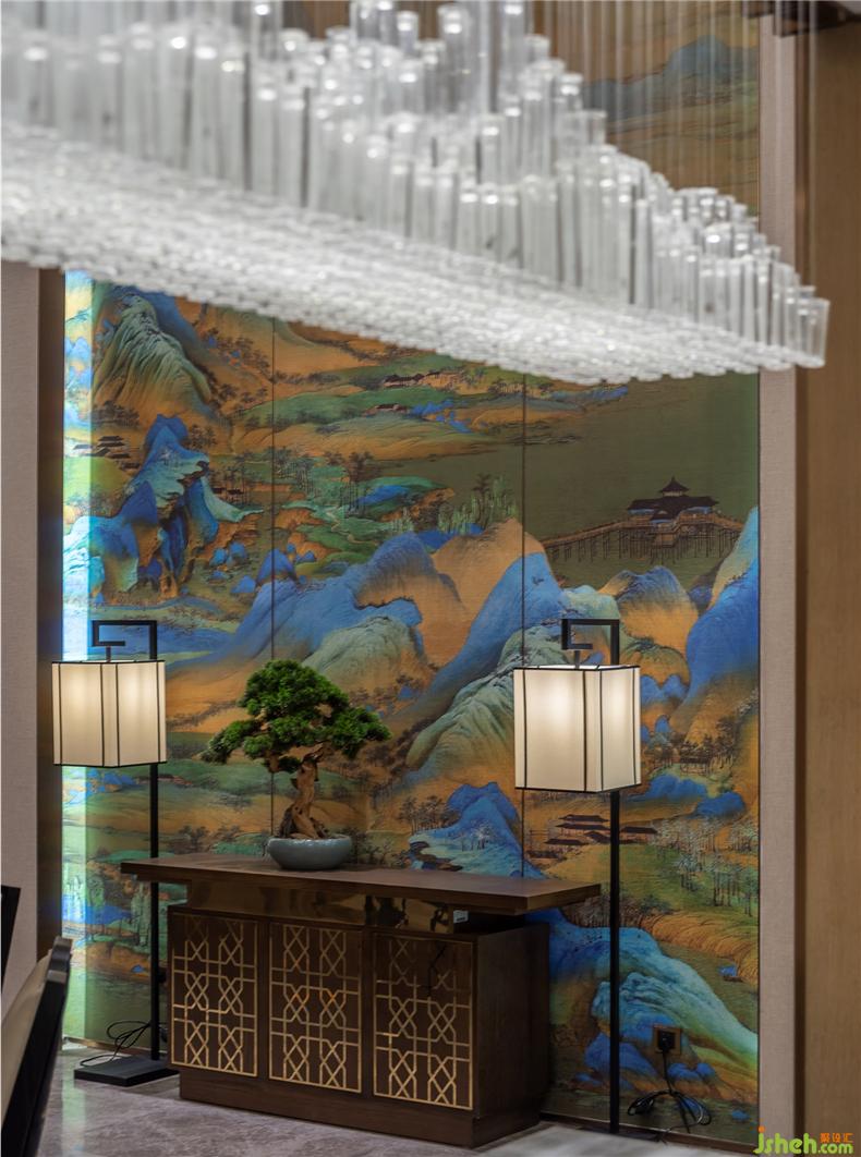 我們把傳世之作《千里江山圖》采用素有國寶之稱的汴秀進(jìn)行一比一還原展示締造空間的瑰麗,絨彩奪目,名繡佳作,競相生輝。以汝窯和官窯的元素以彰顯簡美思想,每一件器具皆是精心挑選,體積、顏色、紋理等不同形態(tài)的呈現(xiàn)對空間美感的縈繞。