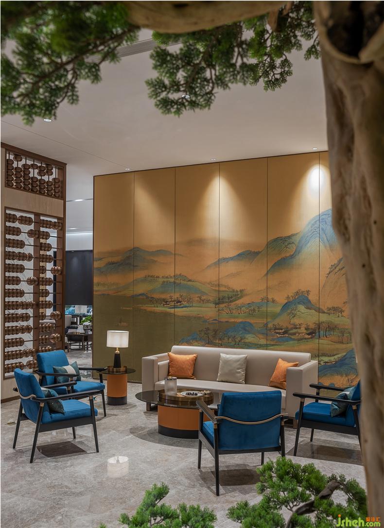 本案設(shè)計(jì)以宋朝的文化意識形態(tài)和思想價(jià)值為主題核心,通過宋代大師王希孟所作的十大傳世名畫---《千里江山圖》勾勒整體設(shè)計(jì)的創(chuàng)作靈魂,于不同樓層之間細(xì)化主題和融入宋詞、書法、花鳥、瓷器、交子等設(shè)計(jì)元素,《千里江山圖》丹青千里,裝修設(shè)計(jì)咫尺亦有千里之趣,以長卷形式描繪了連綿的群山岡巒和浩渺的江河湖水等,描繪精細(xì),意態(tài)生動,把祖國山水的雄奇和壯麗揮灑出了一種雄渾、豪邁的氣魄,從中寓意新東方村鎮(zhèn)銀行未來藍(lán)圖千里江山的宏愿,在最美的年華繪制最美的圖卷。