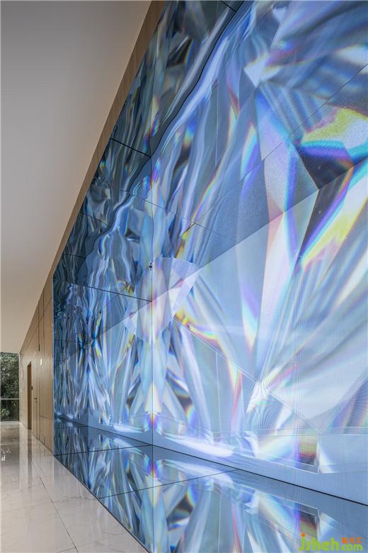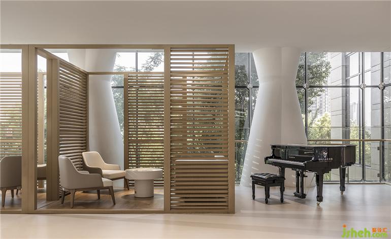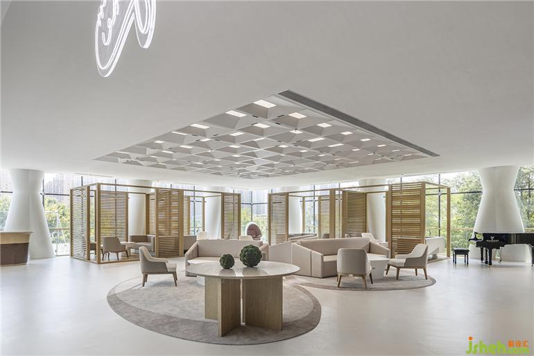 中央沙發(fā)的特殊布局既突破了洽談空間的傳統(tǒng)規(guī)劃,又體現(xiàn)了情感交流的細膩??臻g動線中,客戶的每個駐足節(jié)點都經(jīng)過精心設(shè)計,比如走出電梯的一剎那,客戶不再老生常談地看到機構(gòu)化的接待臺,而是一個影像櫥窗裝置;一層展廳與醫(yī)院大廳的視覺交融被柔美的曲面分隔開,主題明確、隔而不絕;如果留心就會發(fā)現(xiàn),天花的設(shè)計靈感來自泰康的Logo——“一橫一豎”的“人”字在大方塊中劃分出造型,仿佛在各個空間提醒大家泰康初心。