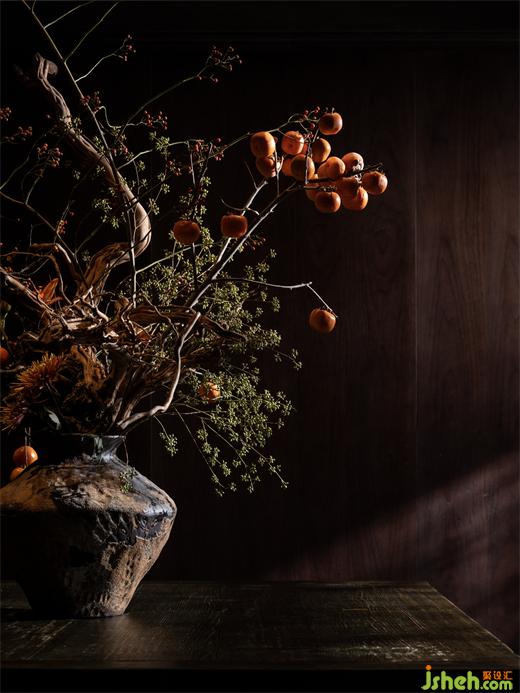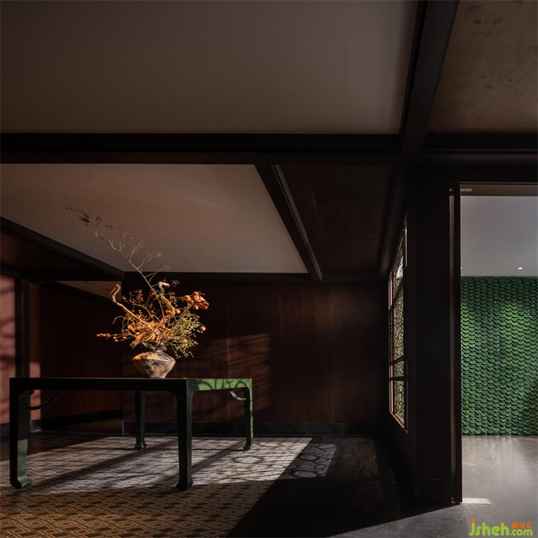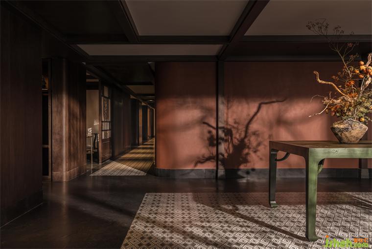 紅墻下,以花磚復(fù)現(xiàn)織錦地毯紋樣,典雅潔凈。古典案幾搭配花藝瓶插在公共區(qū)營(yíng)造出文人畫卷中的虛擬空間,與中國(guó)傳統(tǒng)空間中的格物理想遙相致意。