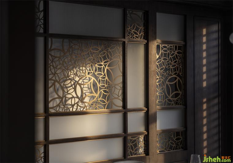 北京餐廳設(shè)計(jì)傳統(tǒng)錢紋經(jīng)過(guò)改良,大量應(yīng)用在窗格和立面隔斷上。紋樣外圓內(nèi)方,環(huán)環(huán)相扣,排布靈動(dòng),既保留了吉祥寓意又掙脫了古板的舊形式,燈光透窗在室內(nèi)各處形成迷人的投影。