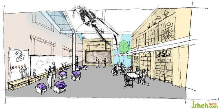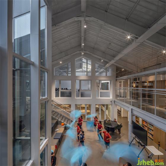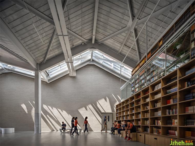 所有教學空間圍繞兩個大型中庭展開:入口中庭更像一個開放式的圖書館,雙層書架的靈感來源于600多年前的牛津圖書館。演講廣場中庭既連接上下兩層,也延伸了教學空間,同時,甚至公共的演講也可以在這里展開。學校裝修設(shè)計屋頂散布的多個天光,一起讓整體建筑靈動而明亮,上下自然聯(lián)通,呈現(xiàn)出動態(tài)的內(nèi)部空間。