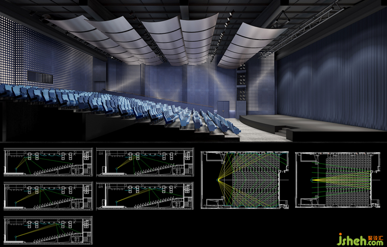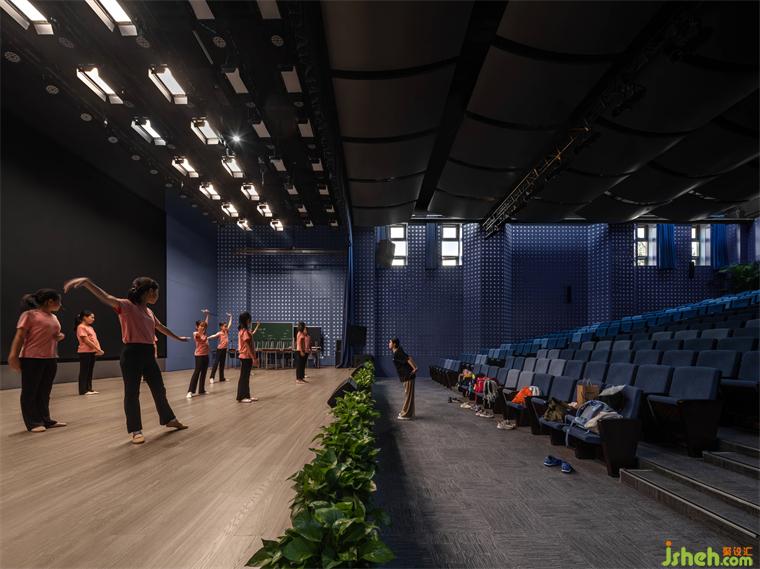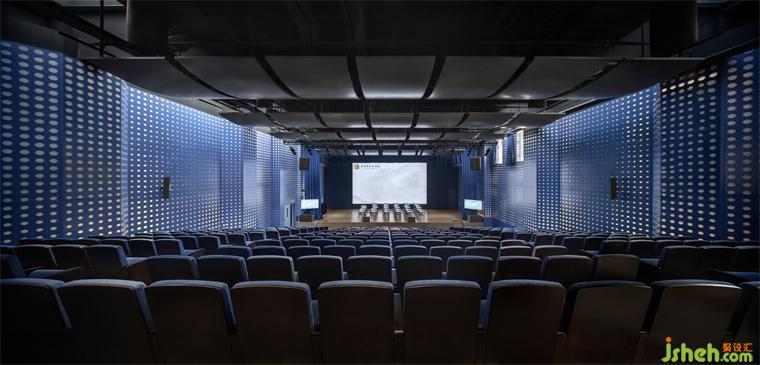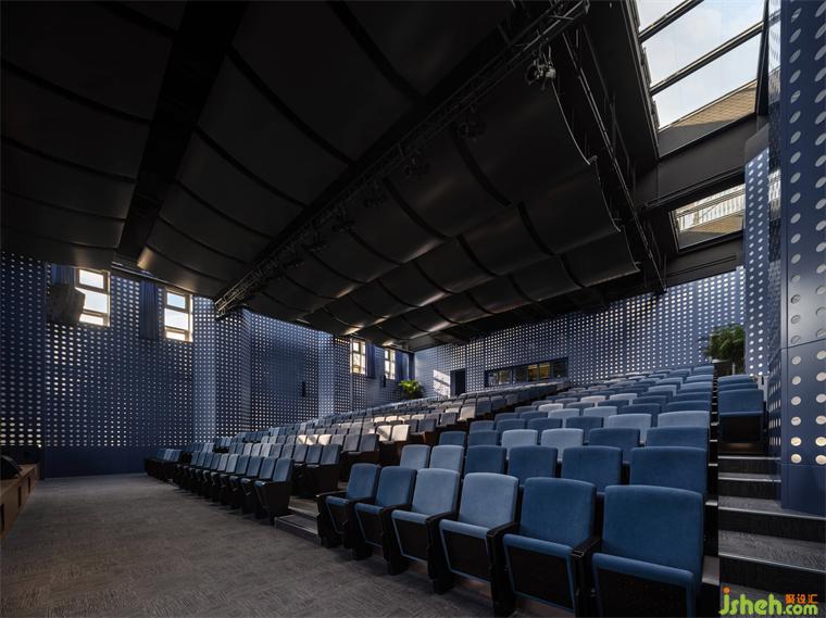 在倉庫空間里支起活動鋼架,使這里可以作為一個300座的階梯式報告廳。這個功能性空間以聲學(xué)設(shè)計為導(dǎo)向:學(xué)校裝修設(shè)計空中懸掛的導(dǎo)聲板力圖讓空間里的每位學(xué)生有幾乎相同的音質(zhì)體驗。同時,墻身上的孔洞既達(dá)到吸聲功效,其特殊的參數(shù)化設(shè)計圖形也呼應(yīng)了正澤學(xué)校精神層面“澤”為“水”的意象。