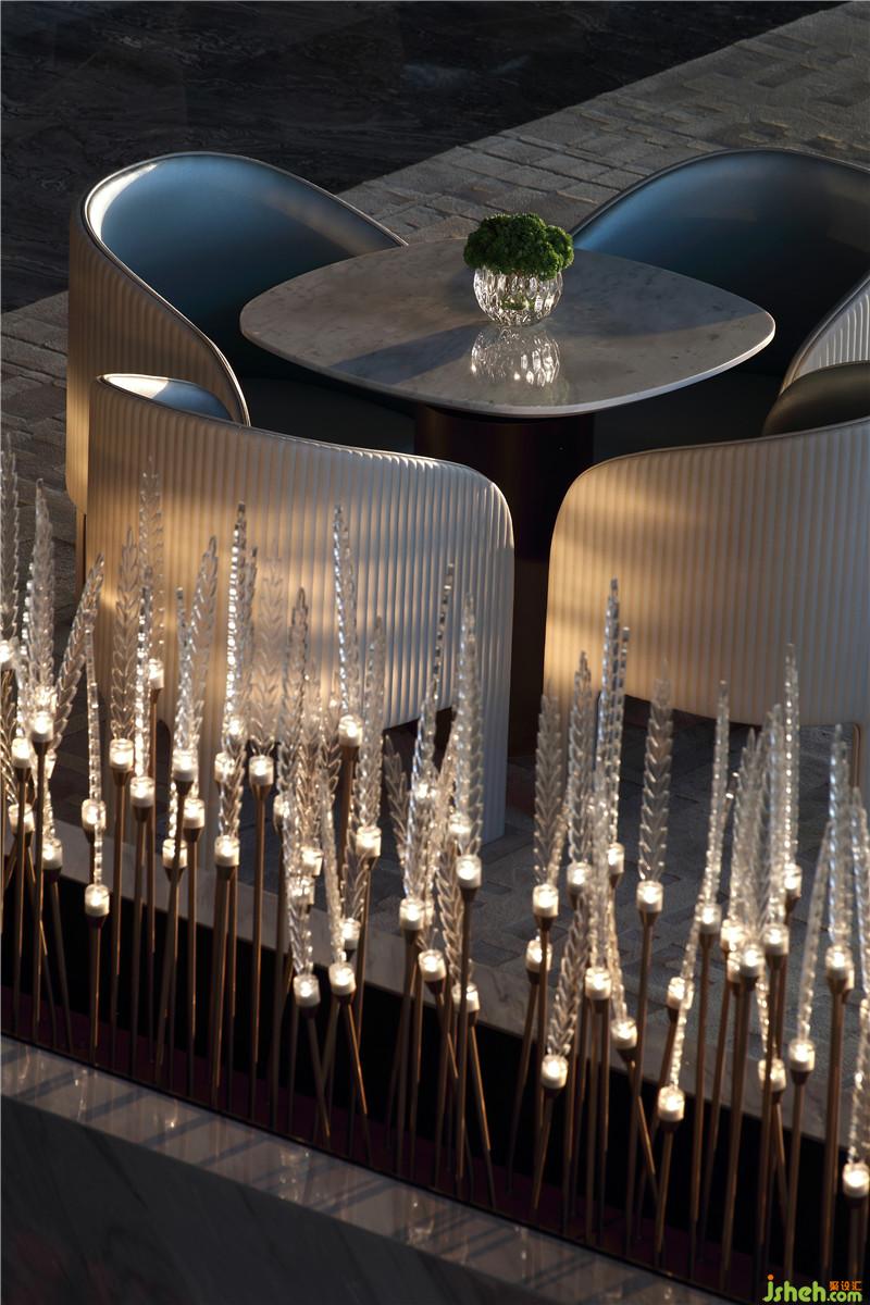 另外,設(shè)計(jì)師還在水吧區(qū)采用“蘆葦”形狀的燈具,空間中大部分的情景采用了“以形化形,層層遞進(jìn)”的表現(xiàn)手法,通過燈具等一系列具有水鄉(xiāng)氣韻的具象實(shí)物,將藝術(shù)形式落實(shí)到空間的各個(gè)角落。