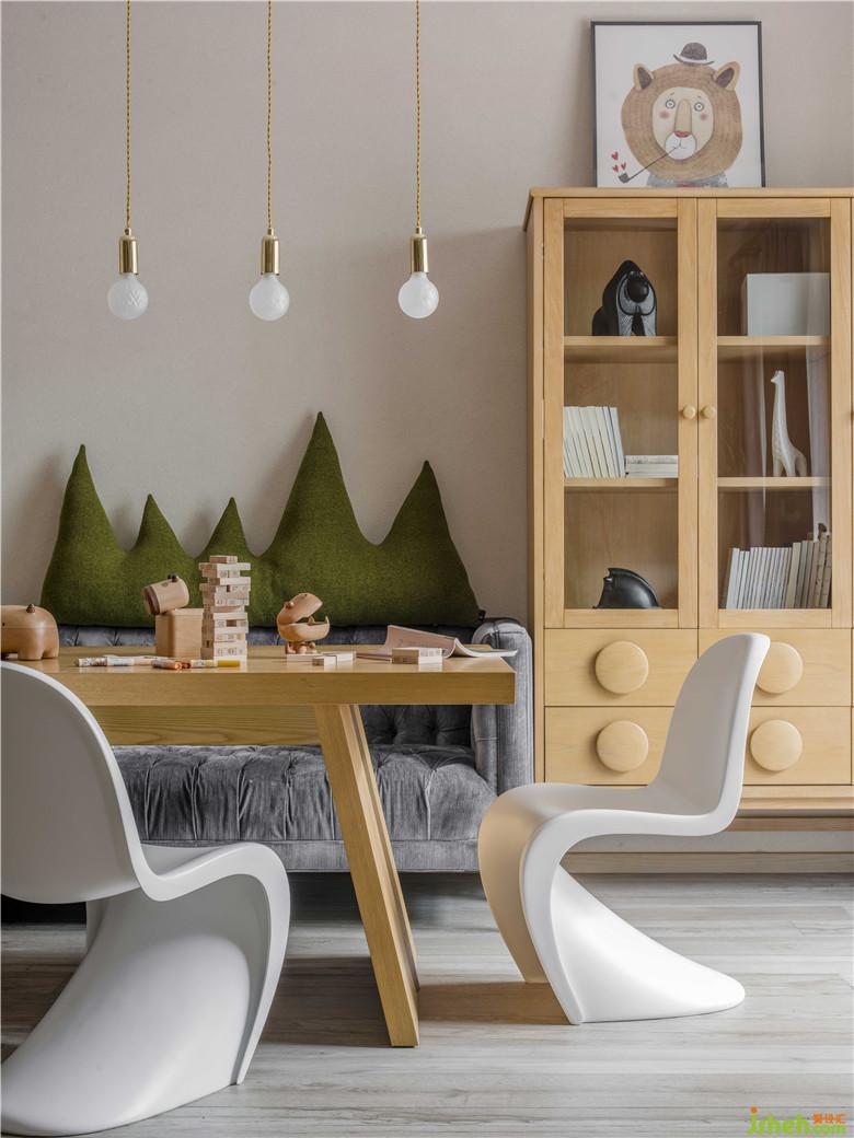 S椅的曲線和垂直向下的吊燈,讓空間更加有趣,兩個(gè)孩子可以在這里畫畫、學(xué)習(xí)、讀書、追逐和玩耍。