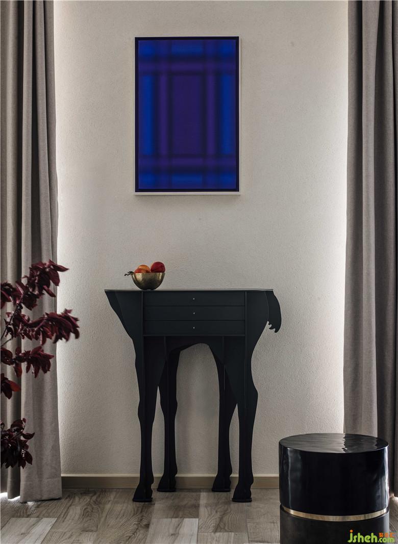 上面搭配的一幅藍色平面的畫,是藝術(shù)家崔云峰《序視》的系列作品之一,他用冷暖、虛實、明暗、筆觸構(gòu)成的視錯覺,形成一種向內(nèi)的空間關(guān)系,激發(fā)出了一種只屬于色彩的能量,生成出了一種純粹的視幻覺效果。