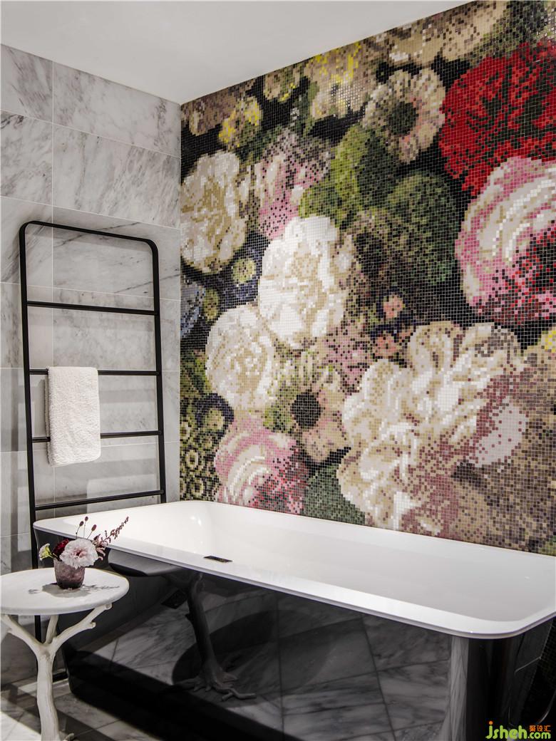 一整面墻的花朵馬賽克是衛(wèi)生間里的亮點,配合香氛設(shè)計,從視覺和嗅覺上給人宛若躺在花叢中沐浴的感覺,仿生設(shè)計貫穿整屋。