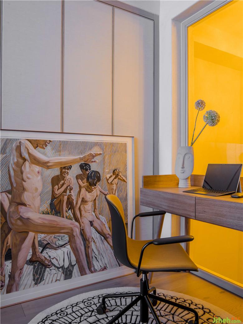 這個空間的功能是書房兼衣帽間,一面明黃色的透光玻璃將明亮和溫暖同時帶來;風(fēng)格和顏色會隨時間的消逝不再是重點,而充滿溫度的記憶的物件才能夠長久留存,一幅劉小東的畫作就作為承載記憶的載體,鎖住瞬間成為永恒。
