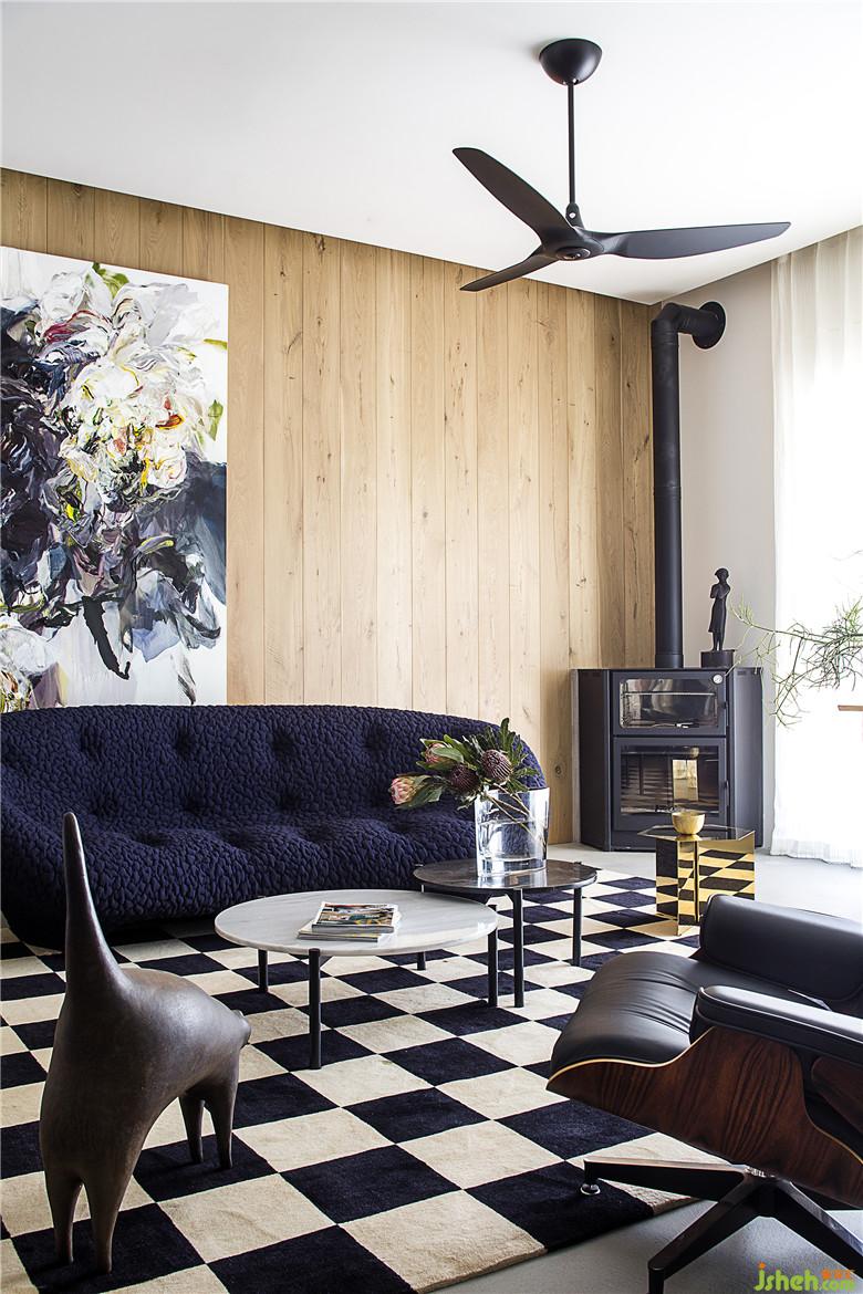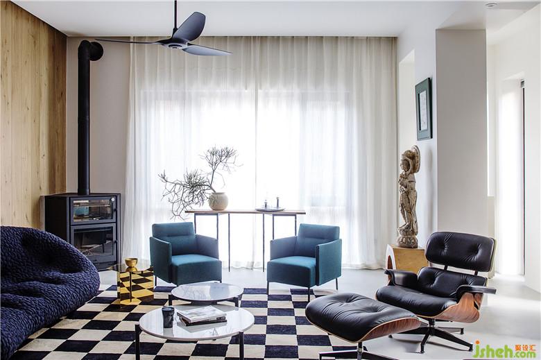 linge roset藍色扶手椅成為客廳視覺焦點,線條洗練明朗,同時又與窗外的自然精致交相呼應(yīng)。