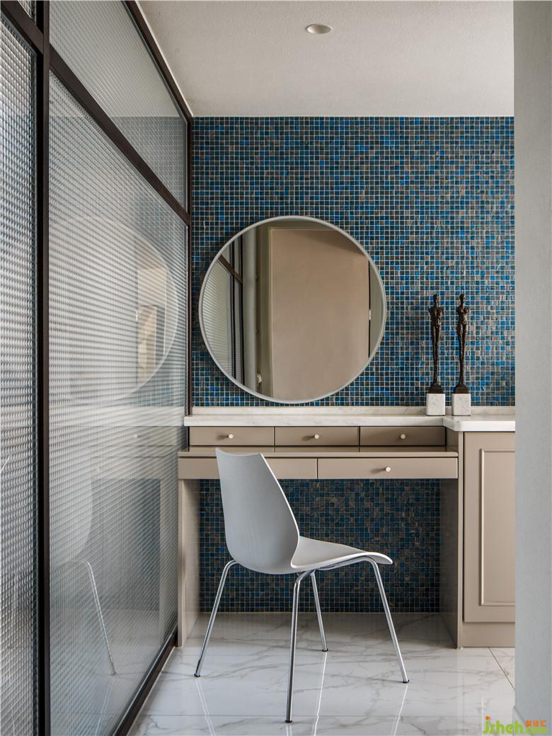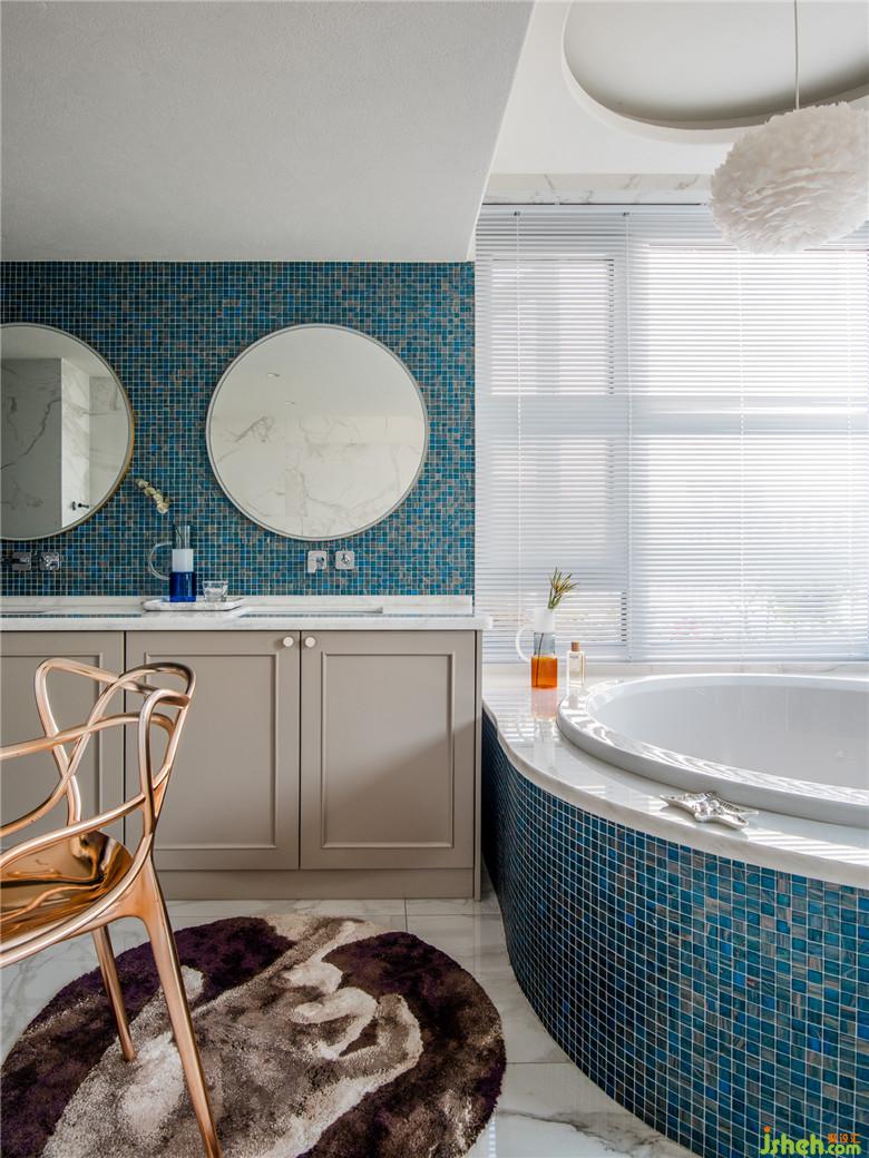 主臥套間的浴室通過改造后,發(fā)生了翻天覆地的變化,從暗衛(wèi)到180度陽光直射,藍色的馬賽克瓷磚搭配白色的百葉窗,清晨蘇醒的陽光在這里迎接每天的美好。