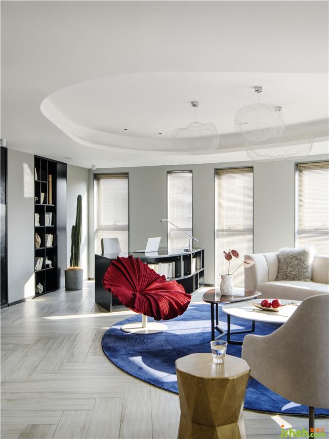 由玄關移步至室內會有一種「異常開闊」的感覺,六大扇兼具現代感與藝術感的條形落地窗一字排開,三里屯SOHU特有的弧形結構讓空間感進一步延伸, 從這里可以俯瞰窗外繁華的街道。