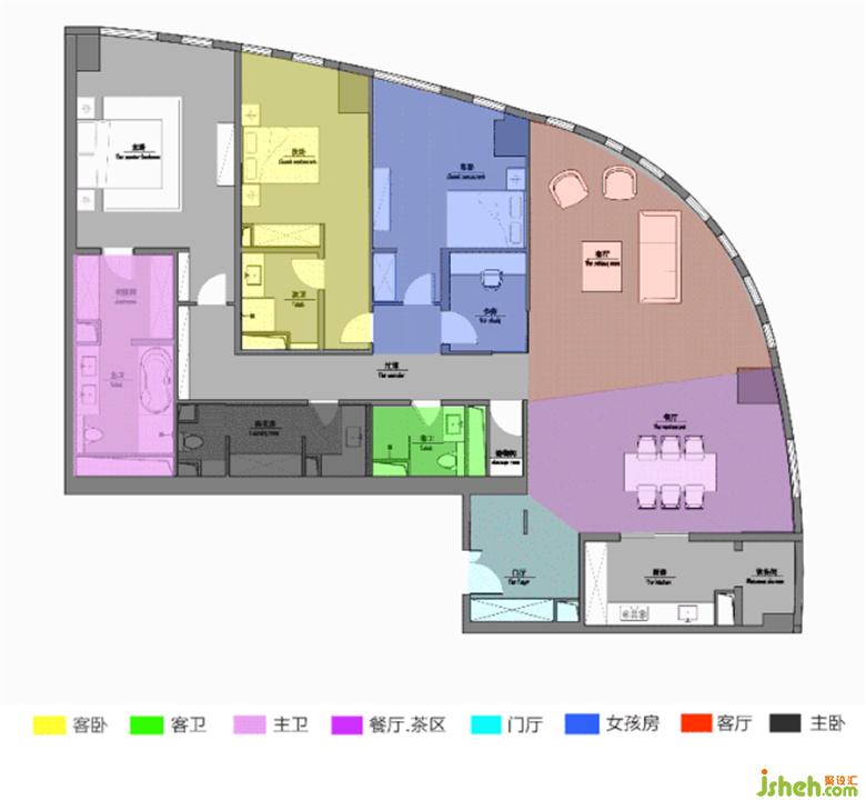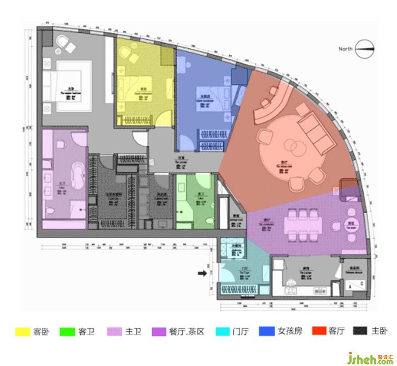 1、把空間從固有扇形結(jié)構(gòu)的束縛中解放出來。平面呈扇形,室內(nèi)大量弧形和非垂直的轉(zhuǎn)角對空間的利用造成諸多限制,按照慣性思維,是無論如何都會出現(xiàn)讓角落閑置的情況。但是,我們堅信206平方米的不算小的面積為解決難題提供了可能性。