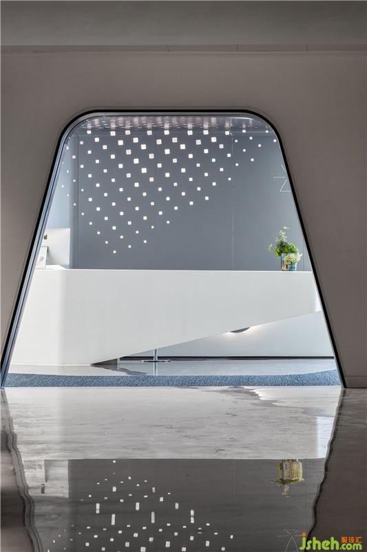 進入空間,隨動線而行,服務(wù)臺背景墻上宛若銀河點點射燈的鋪散,在空間與游動的白色天花造型形成點線面呼應(yīng)。設(shè)計公司