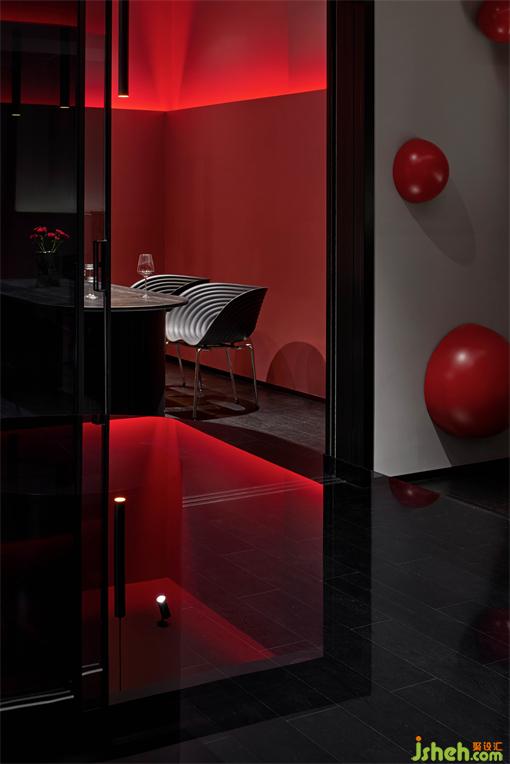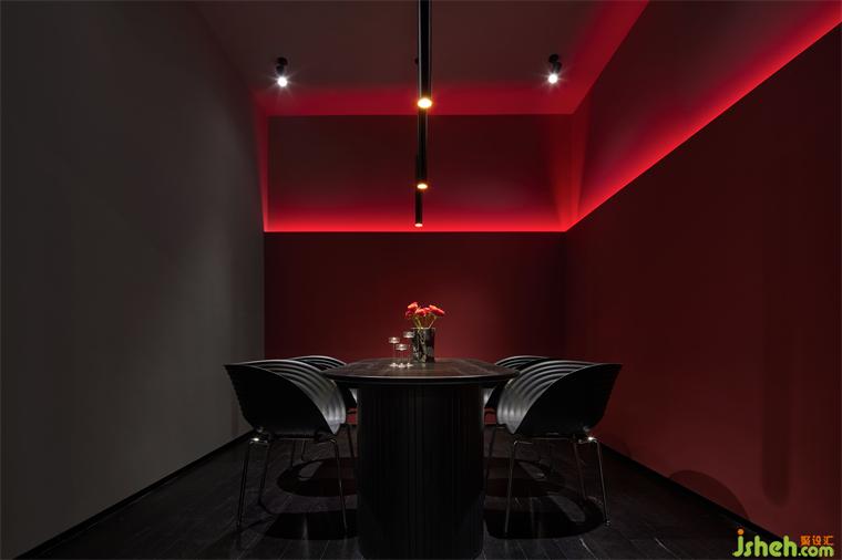 酒莊設(shè)計(jì)整體場地的色彩搭配上,設(shè)計(jì)團(tuán)隊(duì)大面積使用了灰色作為主色調(diào)。在對于主題表達(dá)的紅色漸變關(guān)系處理上,更傾向于依靠可變性更強(qiáng)的紅色燈光而非紅色墻漆來進(jìn)行解決。在一層和二層的地臺(tái)、天花部分,利用RGB變色燈帶進(jìn)行紅色光線的漫反射呈現(xiàn),以漸變的紅光,來渲染空間神秘、曖昧的微醺氛圍。